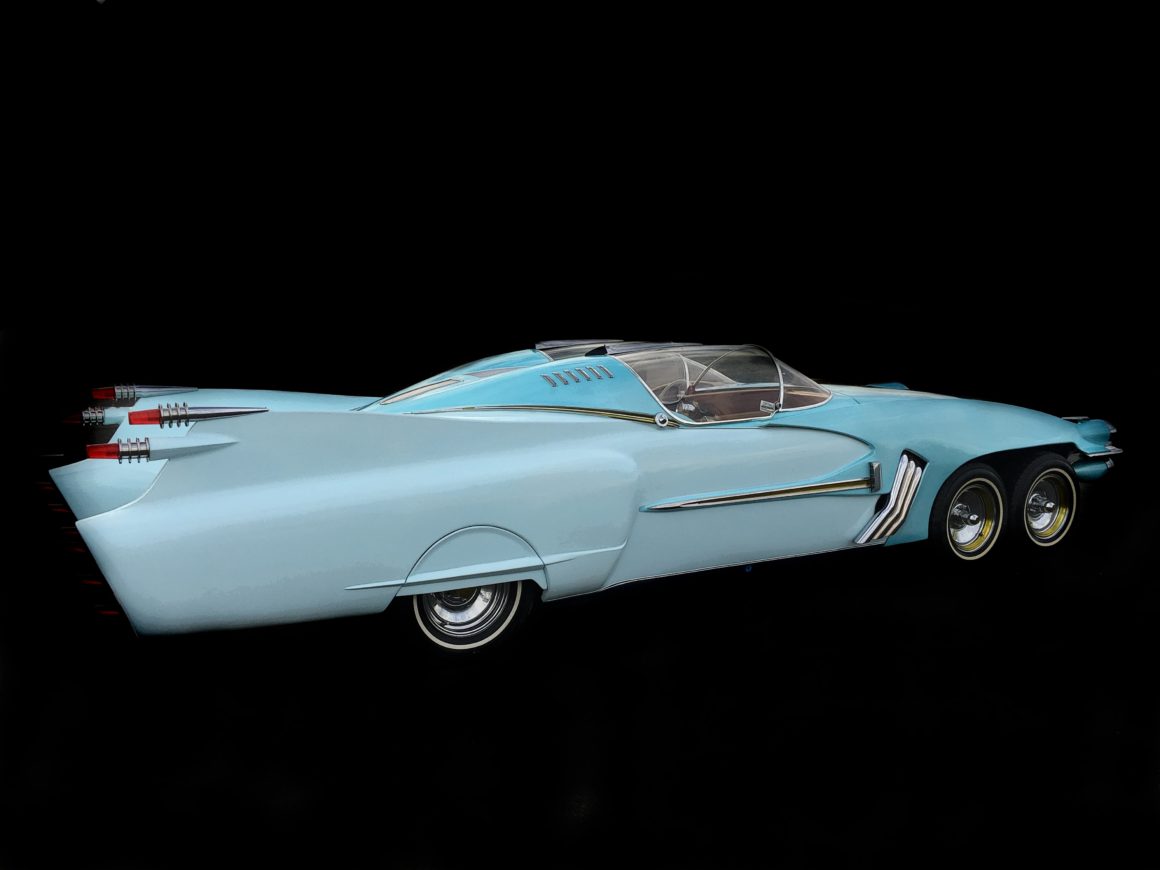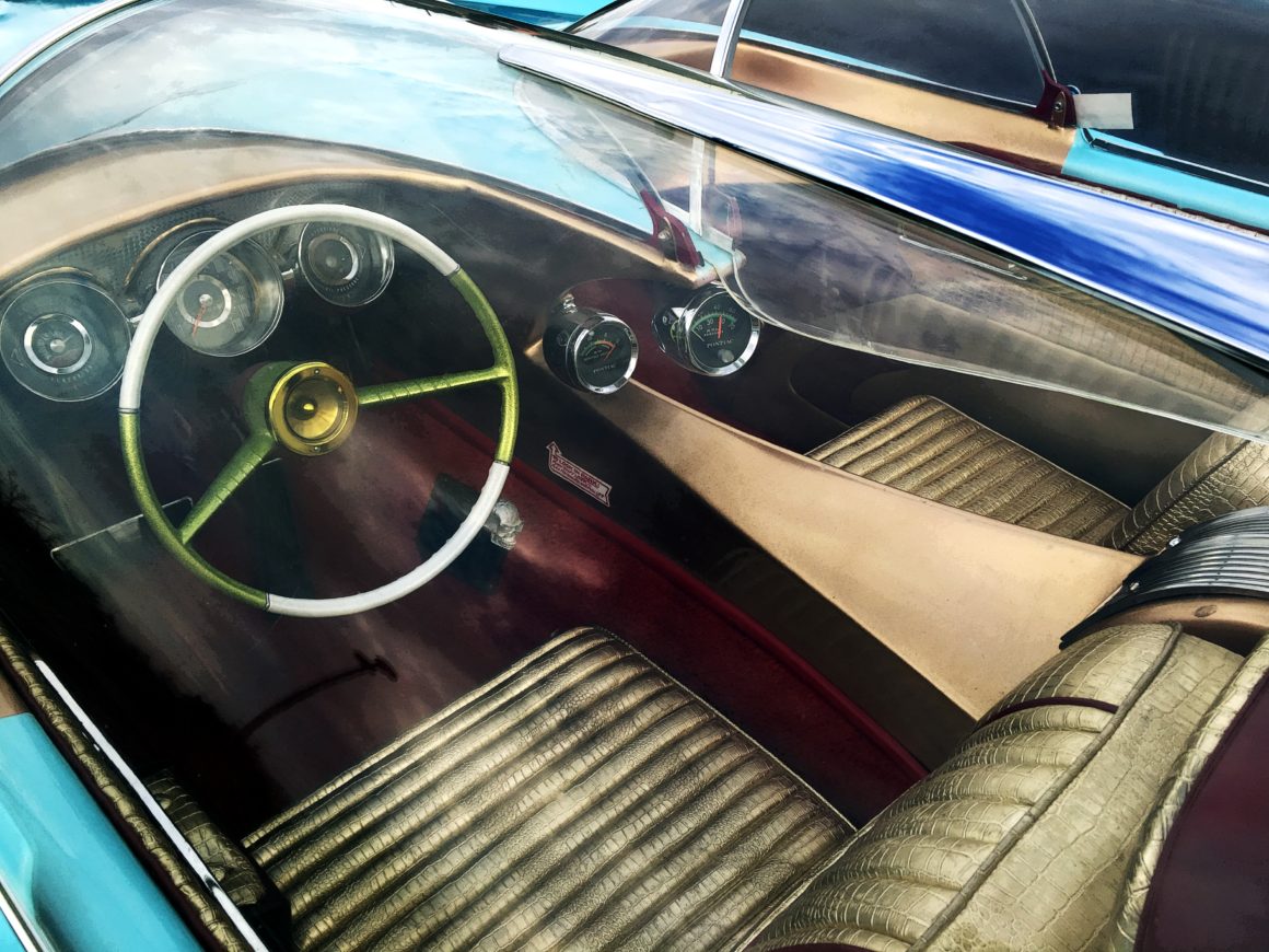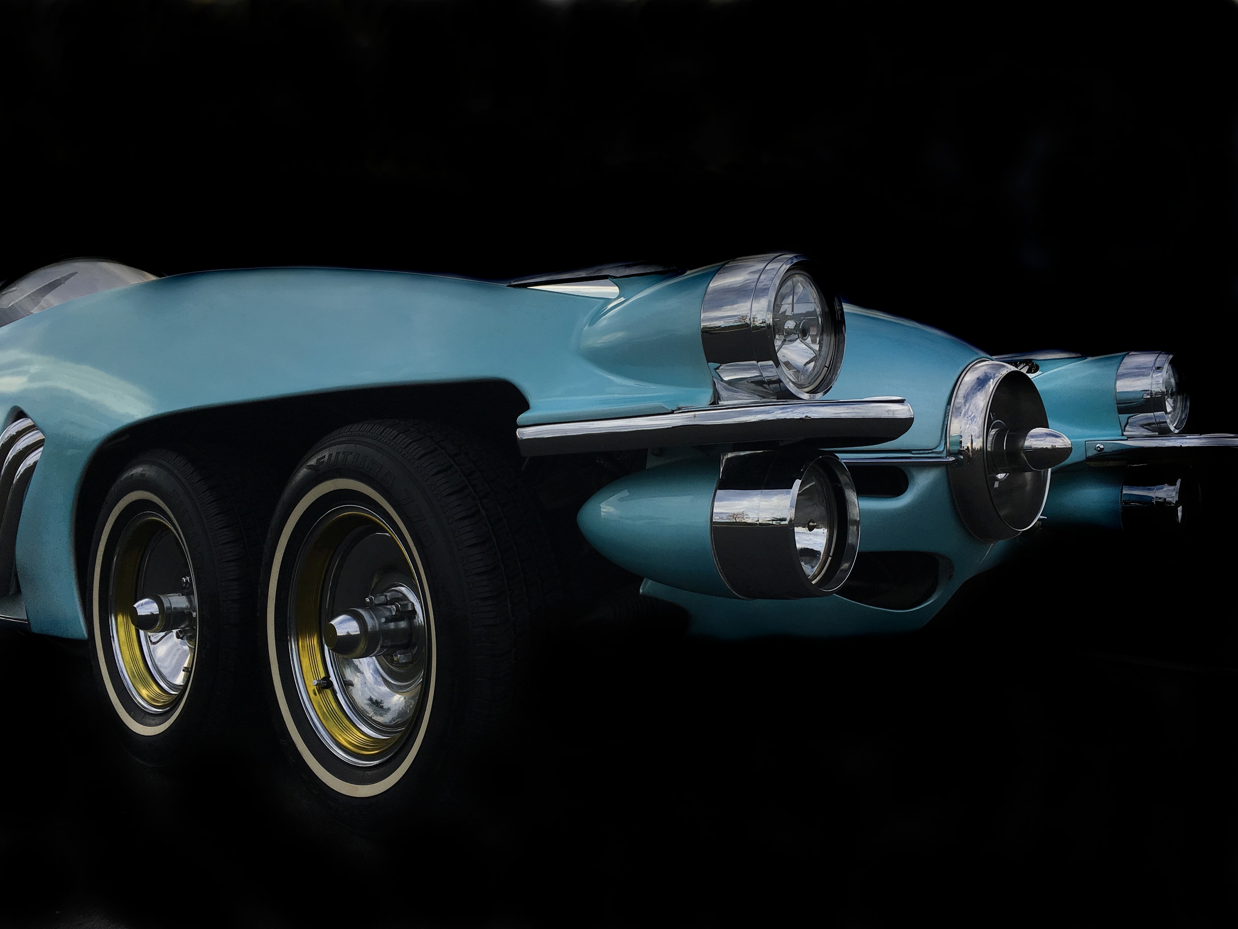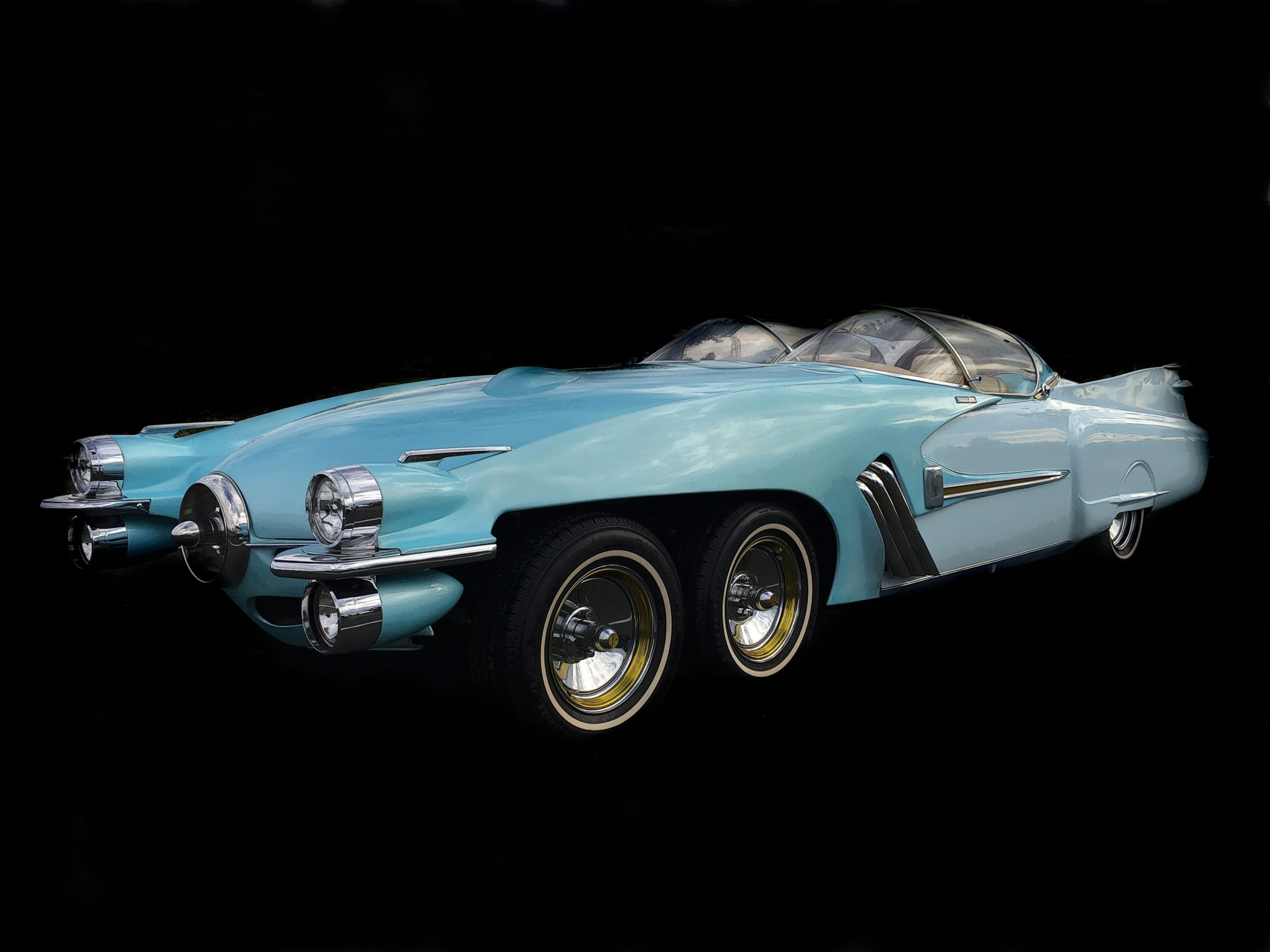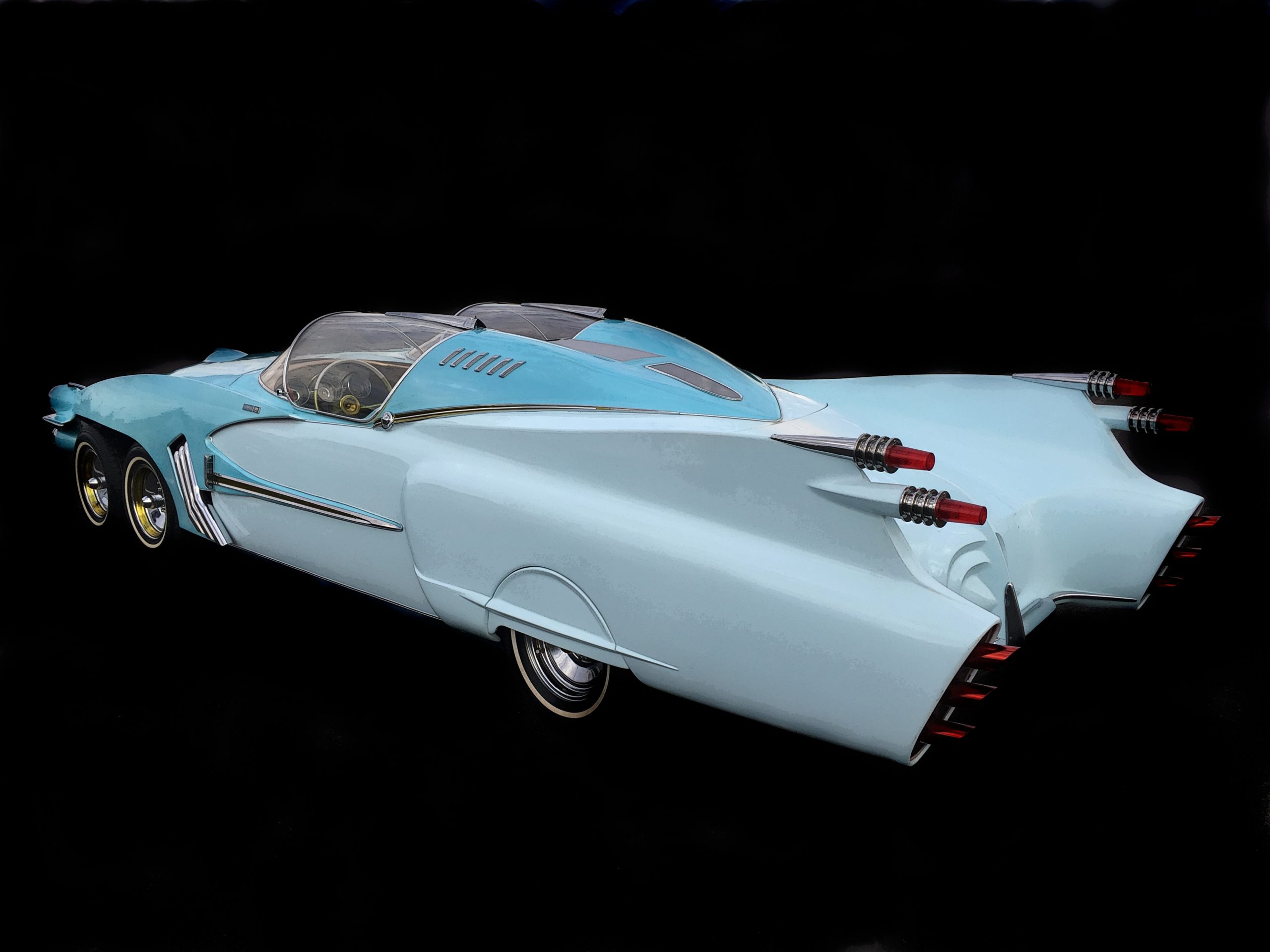 – Elle mesure 6,09 m, le moteur est un Cadillac V8 500 cid de 8,3 litres, la vitesse maxi est de 225 km/h… Initialement elle était bien plus longue,j’ai finalement abandonné l’idée d’une 8 roues au dernier moment ! Ca ne rentrait pas vraiment dans la cohérence du tout que j’avais imaginé pour diverses raisons, et on m’a dit que mon Ice Princess aurait tout autant d’impact avec 6 roues. Les caractéristiques essentielles sont le train avant à 4 roues, les 4 phares fuselés, les ailerons d’Imperial surmontant des tuyères de réacteurs dans le style des Cadillac début sixties et bien sûr le double bubble top dans l’esprit de la Lincoln Futura, c’est assez proche de deux cockpit de F4 Phantom jumelés. L’intérieur très Jet âge est complètement dans l’esprit des customs de show du début des sixties avec ses teintes dorées.