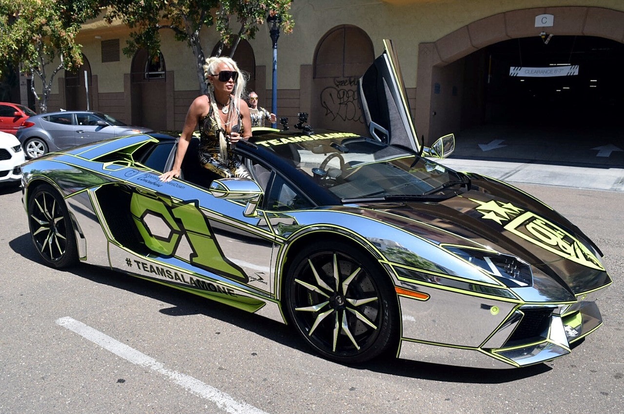 Bryan Salamone à même créé le “Team Salamone” dont le logo est un énorme pénis… et la voiture vedette de ce club est sa Lamborghini Aventador décorée entièrement d’un adhésif imitation chrome et munie d’une plaque d’immatriculation «Winner» qui est une référence anale à Charlie Sheen, un gag ironique, mais douteux, d’autant qu’il a effectivement partouzé avec Charlie Sheen et une douzaine de filles avec de très gros seins, un évènement sportif ou a participé Ice-T, ce qui est peut-être la seule chose rédemptrice qui restera dans les anales (les annales c’est autre chose)…à son sujet (nous aimons toutes et tous Ice-T, il a beaucoup de merde-marchandise derrière lui, c’est un spécialiste officiel) !