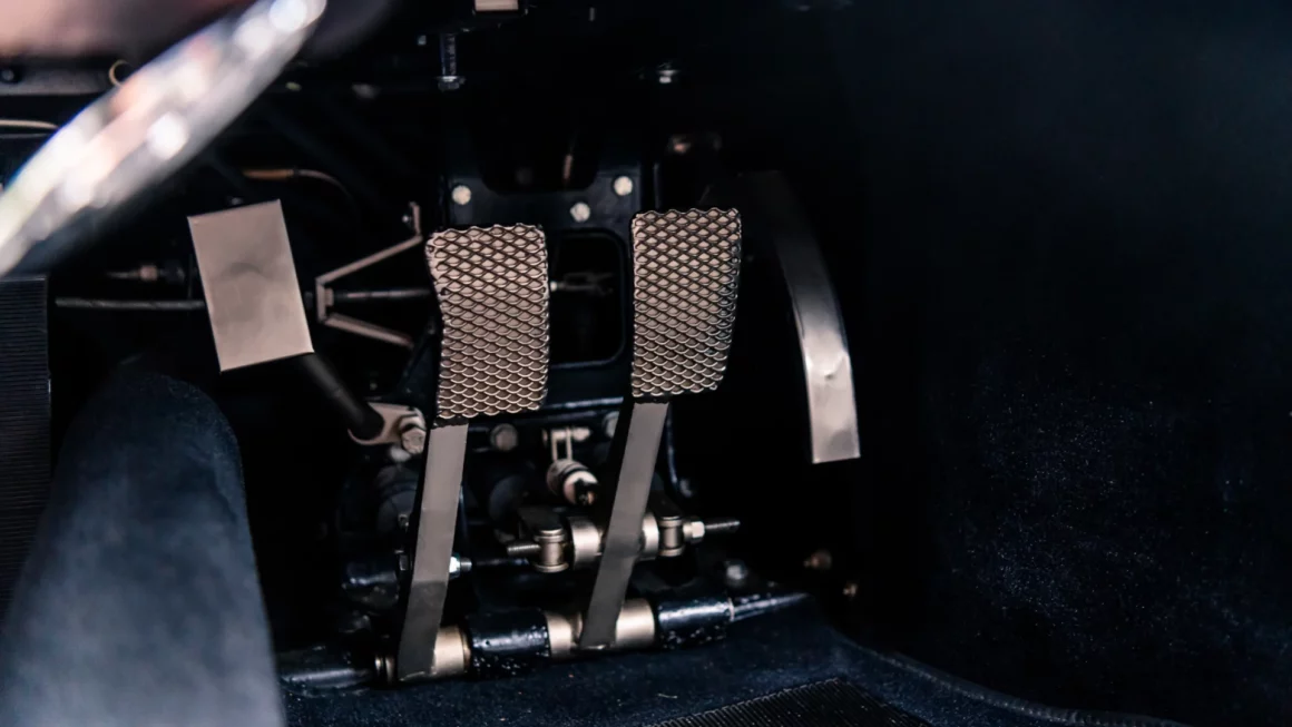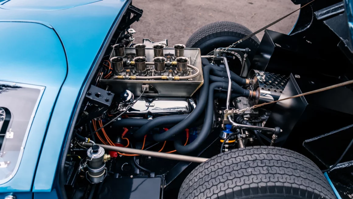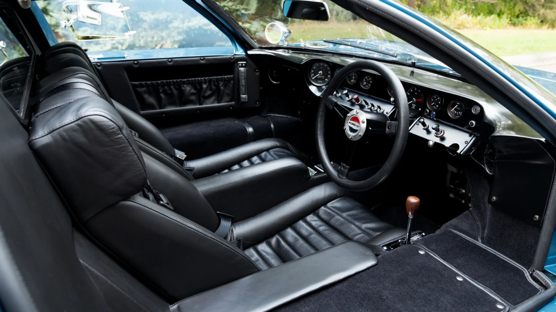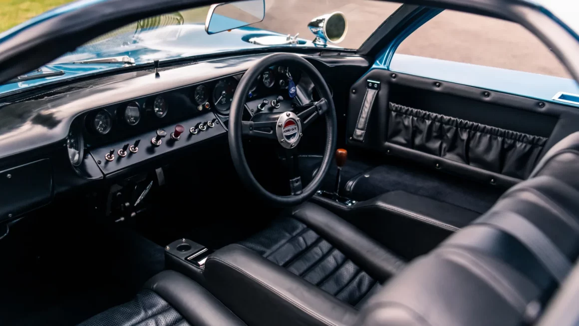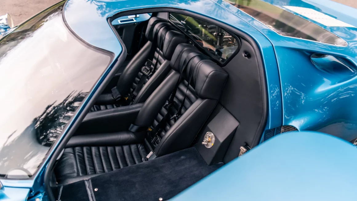 Cette voiture est RHD mais le levier de vitesses se trouve du côté droit du conducteur, entre le siège et la porte, plutôt que d’être au centre. Le tachymètre se trouve directement derrière le volant, ce qui est logique pour une machine de compétition. La légende de la Ford GT40 s’est construite sur les pistes de course, mais les rarissimes 30 exemplaires “Street Version Première Série” sans l’allongement du cul pour un coffre, bravant les embouteillages aux heures de pointe, ont apporté une contribution non négligeable à la légende. Qui conduit une Ford GT40 “Street version” sur la voie publique, doit être prêt à tout…