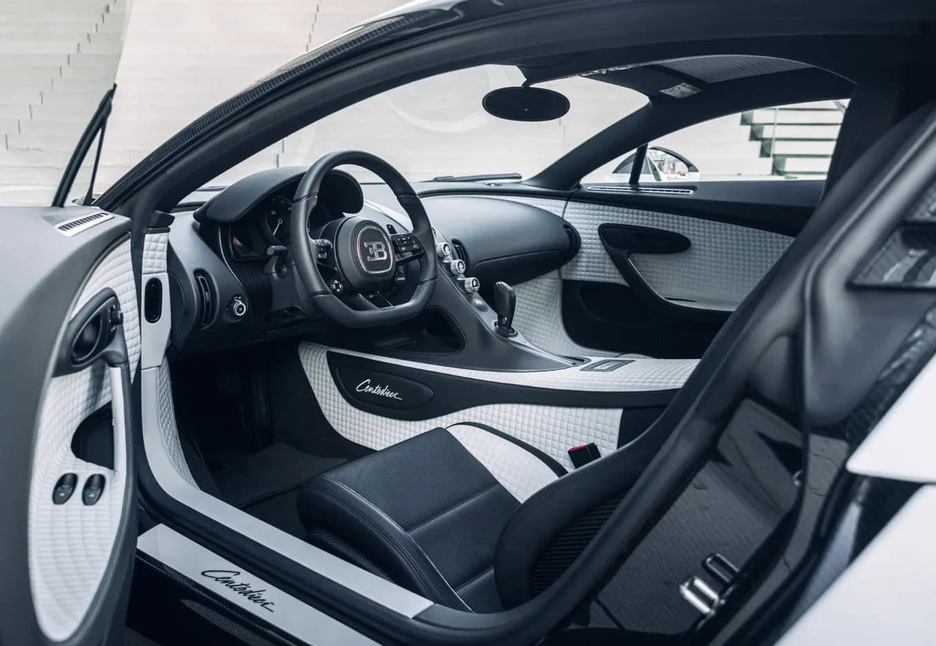 Le contrat d’achat et la fiche technique Bugatti du dossier de cette Bugatti porte soit le numéro 001 dans l’habitacle, le numéro 006 sur une plaquette du compartiment moteur et un autre numéro correspondant à un tracteur de ferme, a été commandé neuf en août 2019 par un collectionneur suisse finie dans une livrée bicolore blanc-neige quartz avec un intérieur garni de cuir Beluga Black et Gris avec des garnitures anodisées noires.