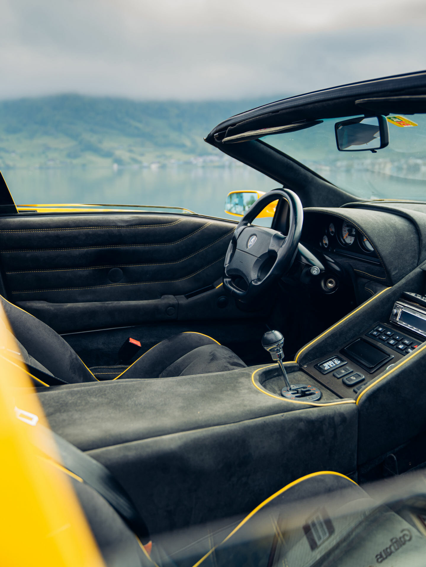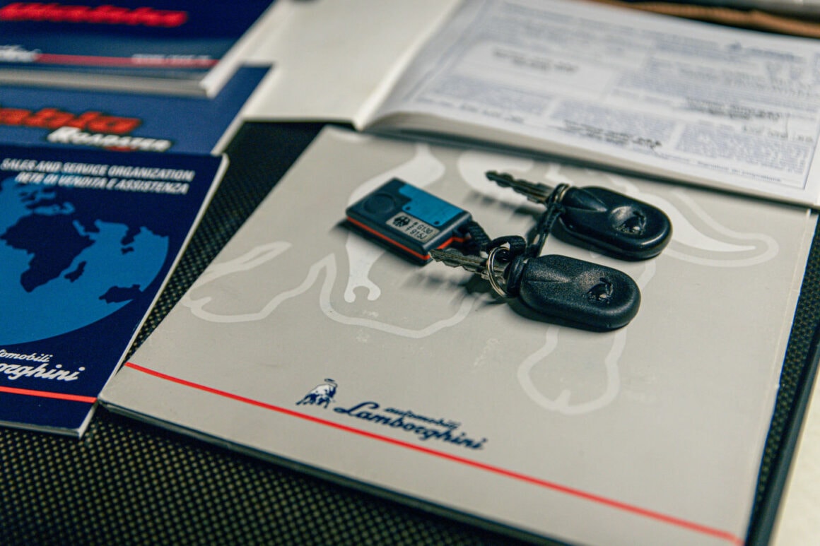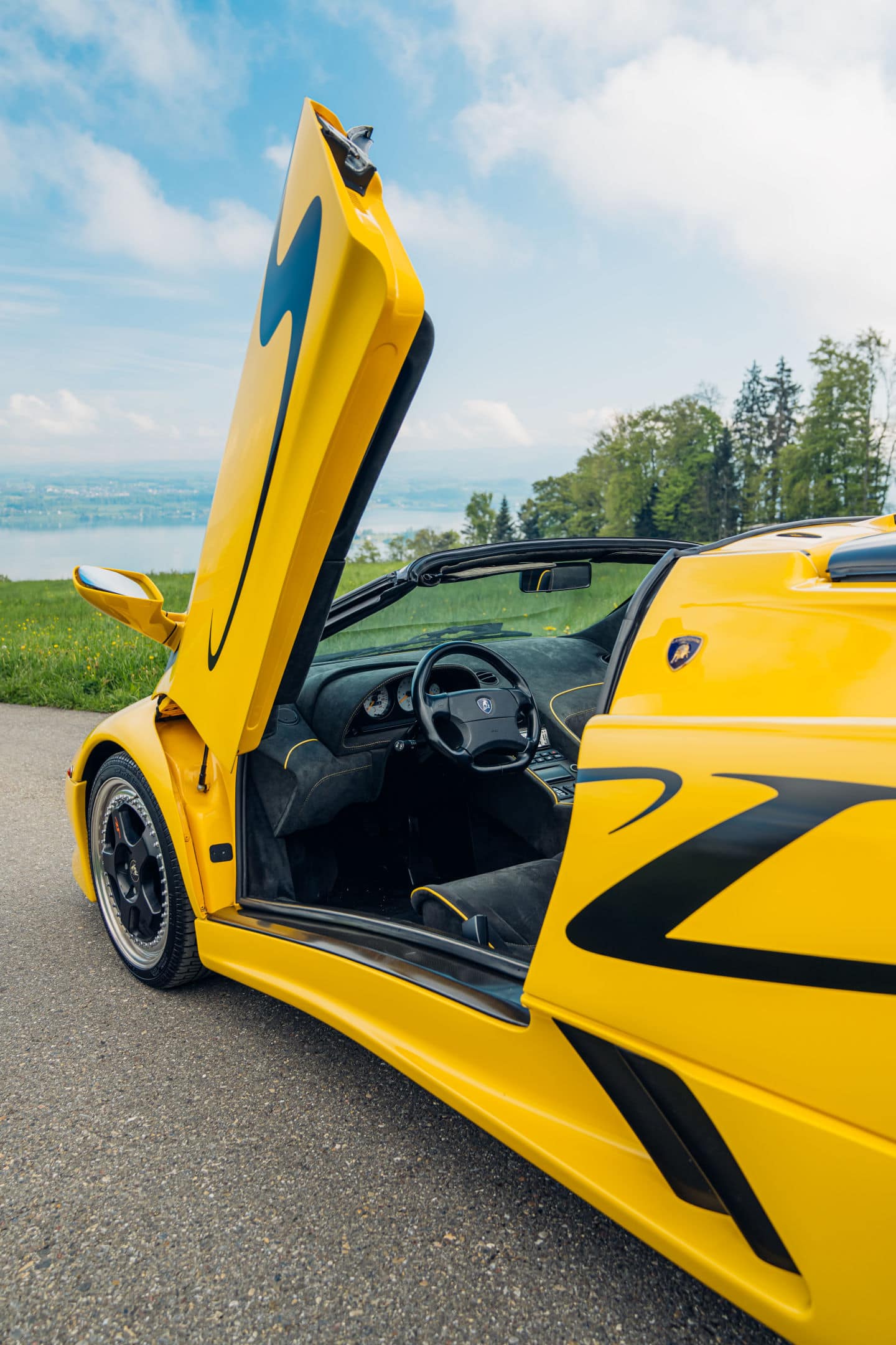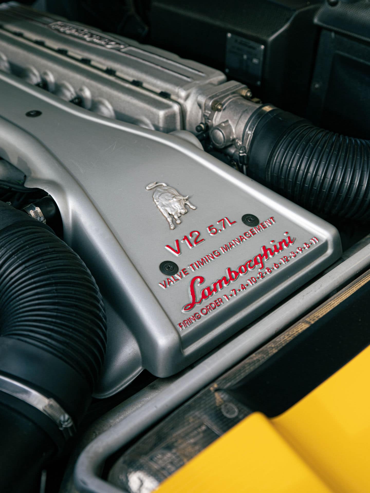 Il était fini selon les spécifications de 1998. La voiture a été livrée au concessionnaire officiel Lamborghini Touring Auto S.r.l, dont le siège social était à Milan, Corso Porta Romana, et sa carte de garantie a été délivrée le 5 juin 1998. La voiture a été configurée de manière spectaculaire, avec une finition dans la teinte accrocheuse du Roadster Giallo sur un intérieur en Alcantara Nero “Torpedo” avec un passepoil jaune complémentaire et des surpiqûres “SV “.