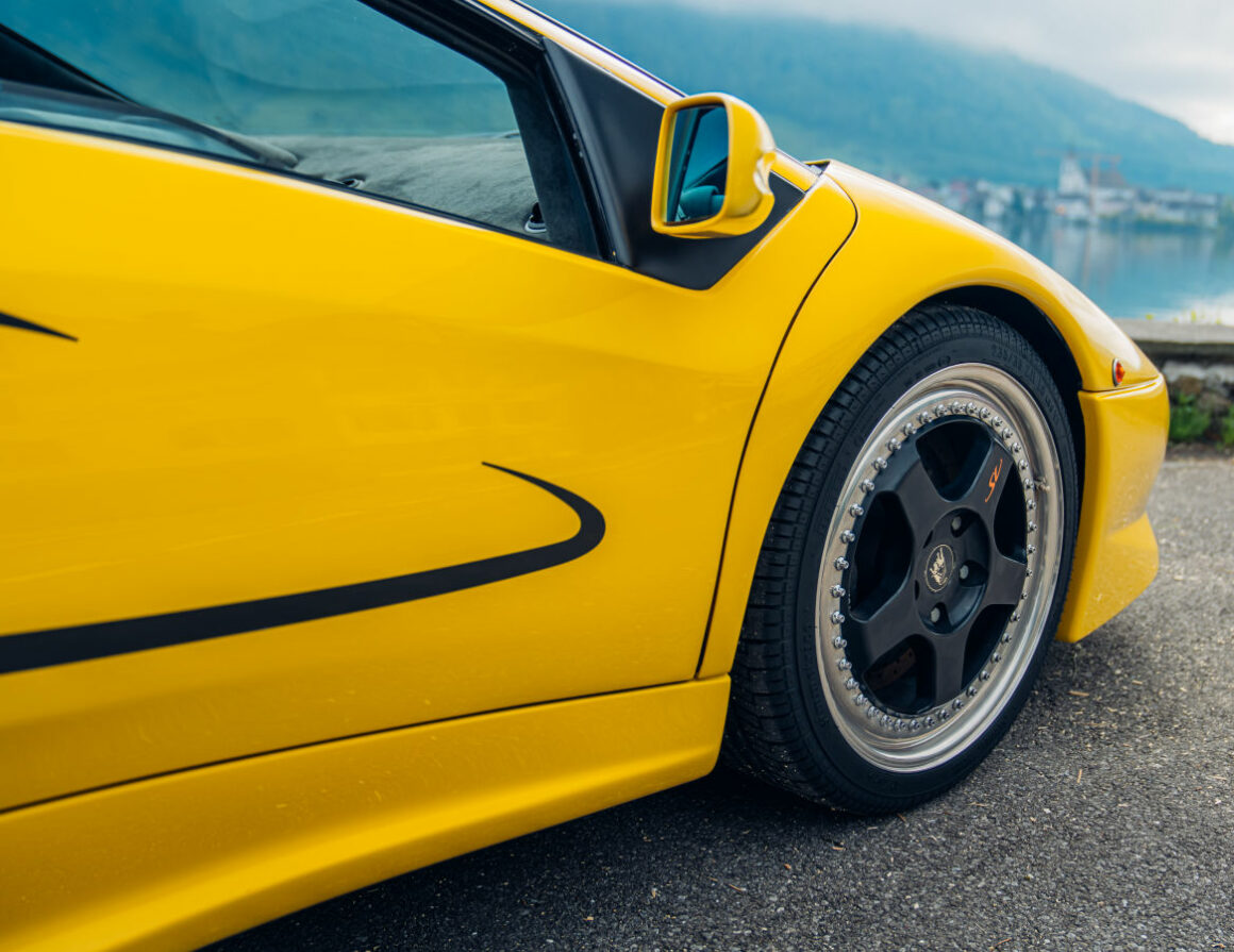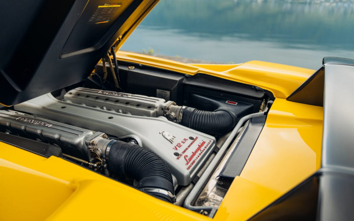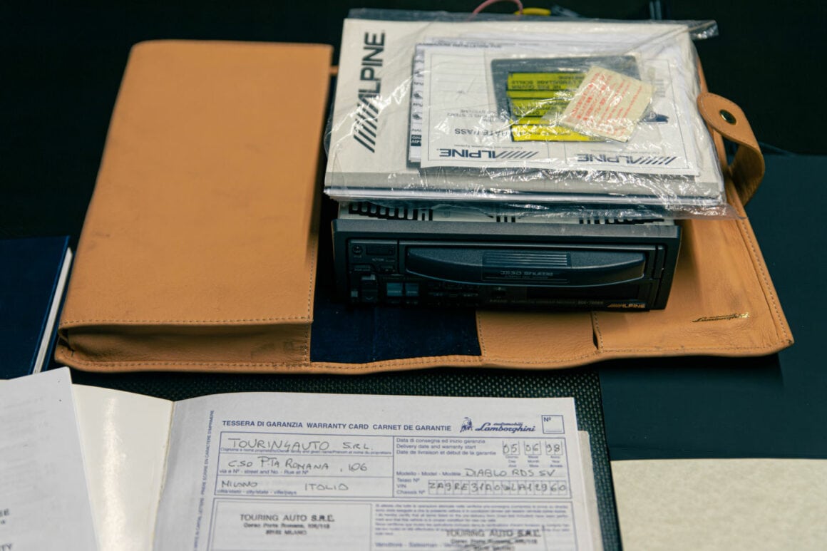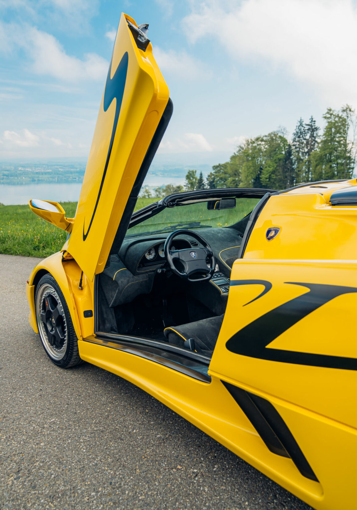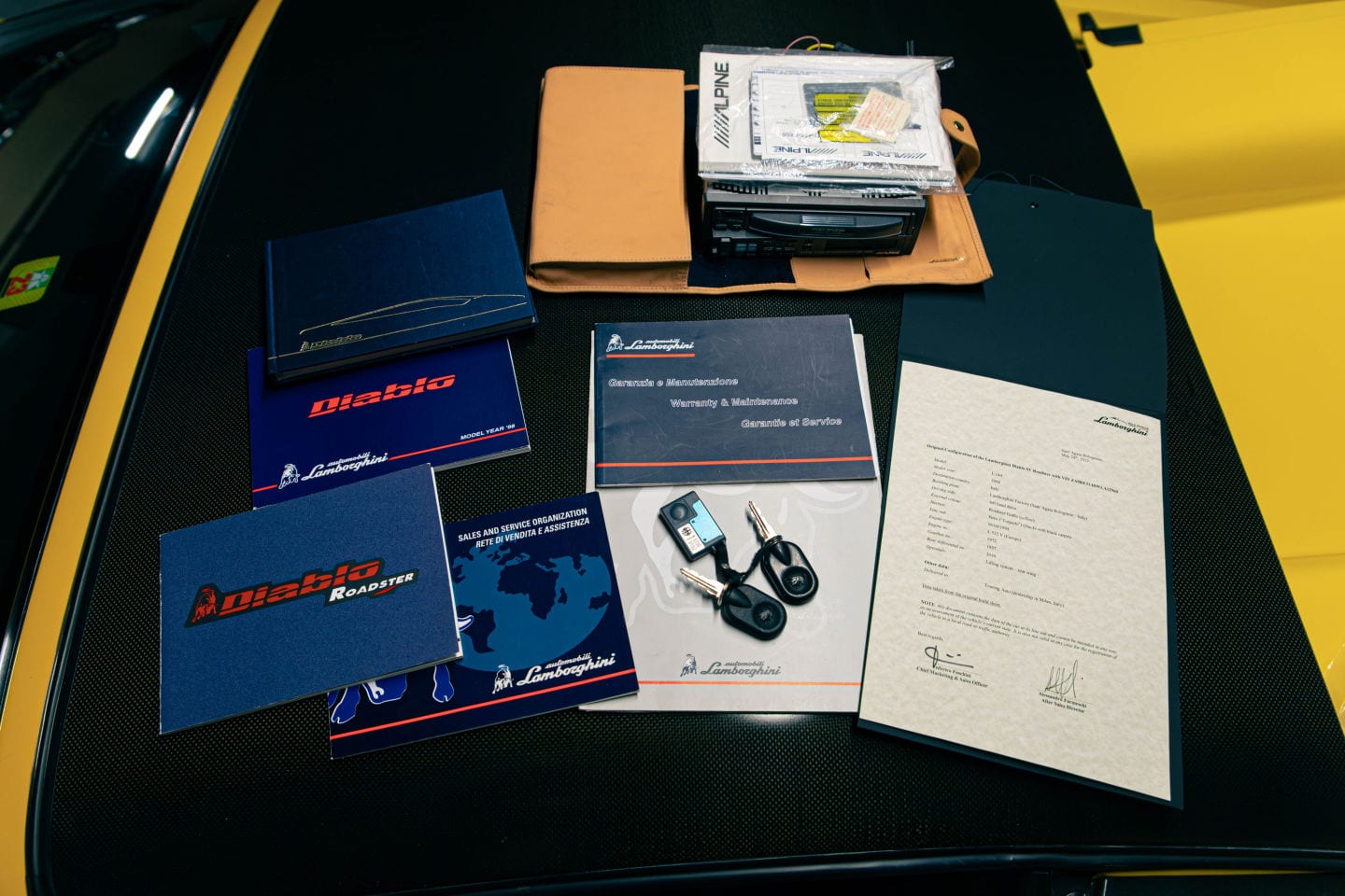 Il était fini selon les spécifications de 1998. La voiture a été livrée au concessionnaire officiel Lamborghini Touring Auto S.r.l, dont le siège social était à Milan, Corso Porta Romana, et sa carte de garantie a été délivrée le 5 juin 1998. La voiture a été configurée de manière spectaculaire, avec une finition dans la teinte accrocheuse du Roadster Giallo sur un intérieur en Alcantara Nero “Torpedo” avec un passepoil jaune complémentaire et des surpiqûres “SV “.