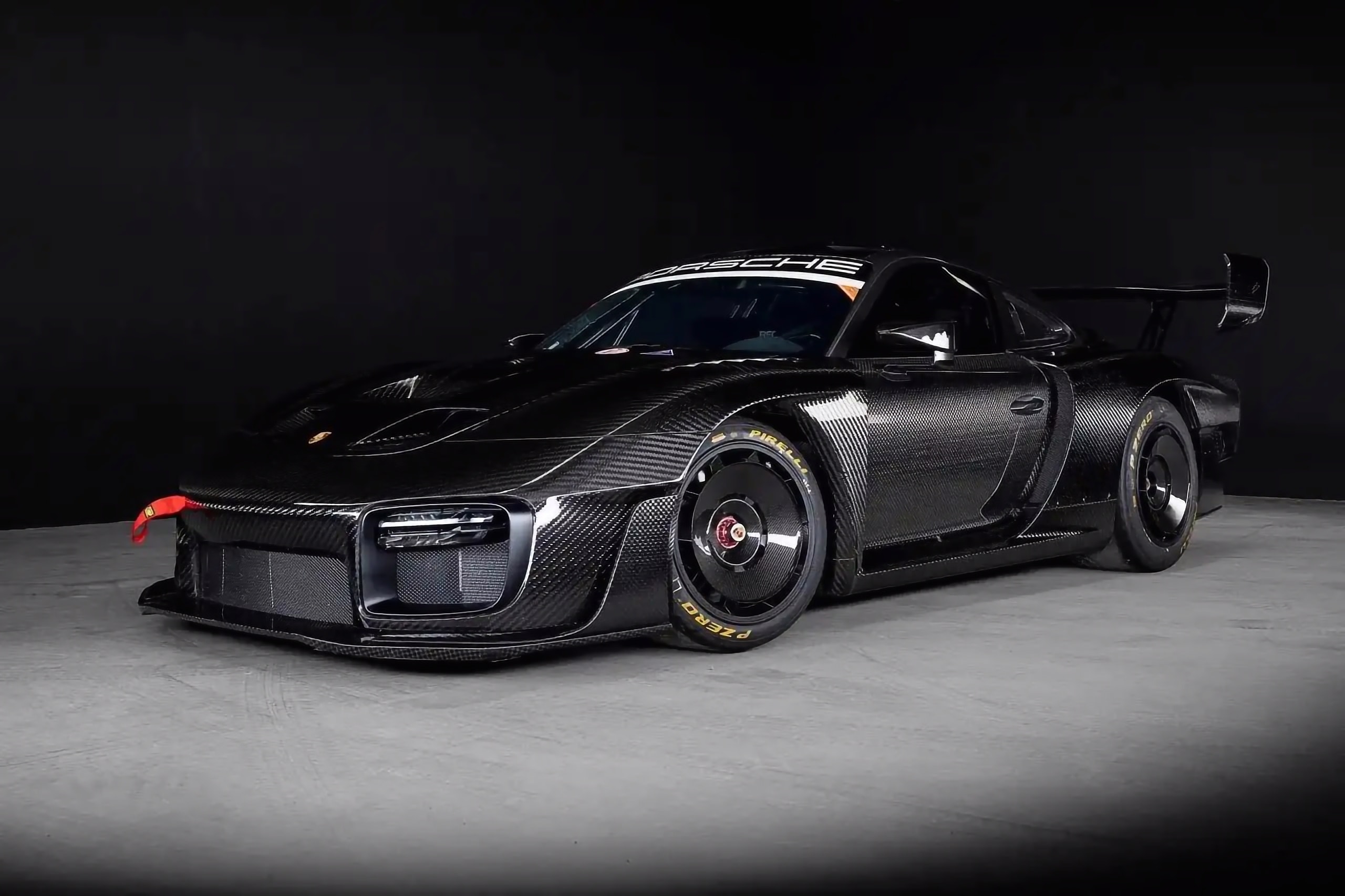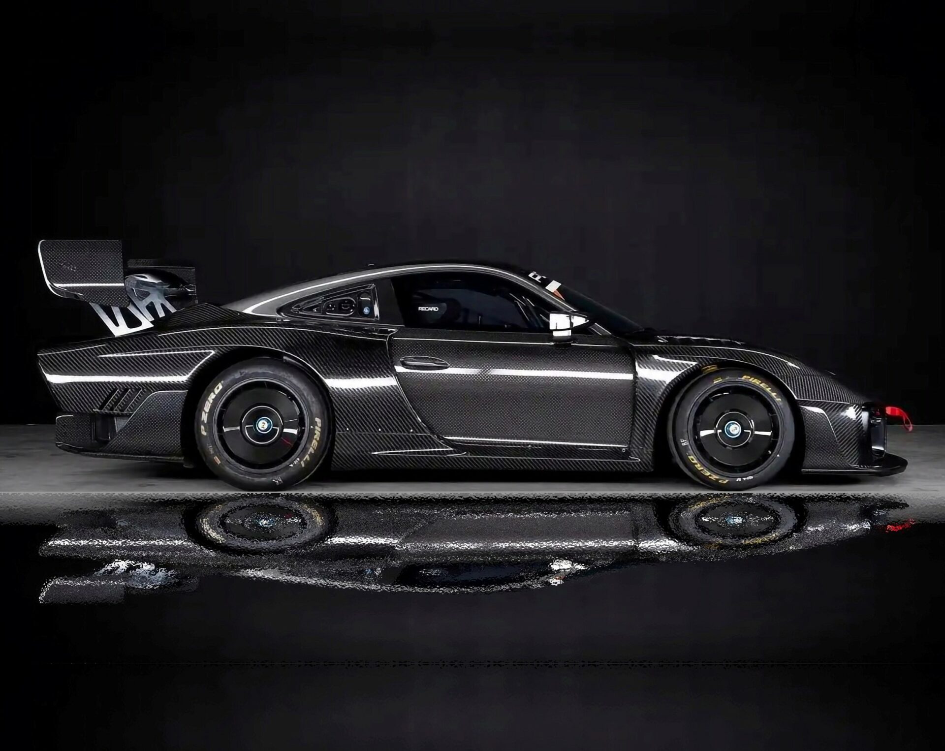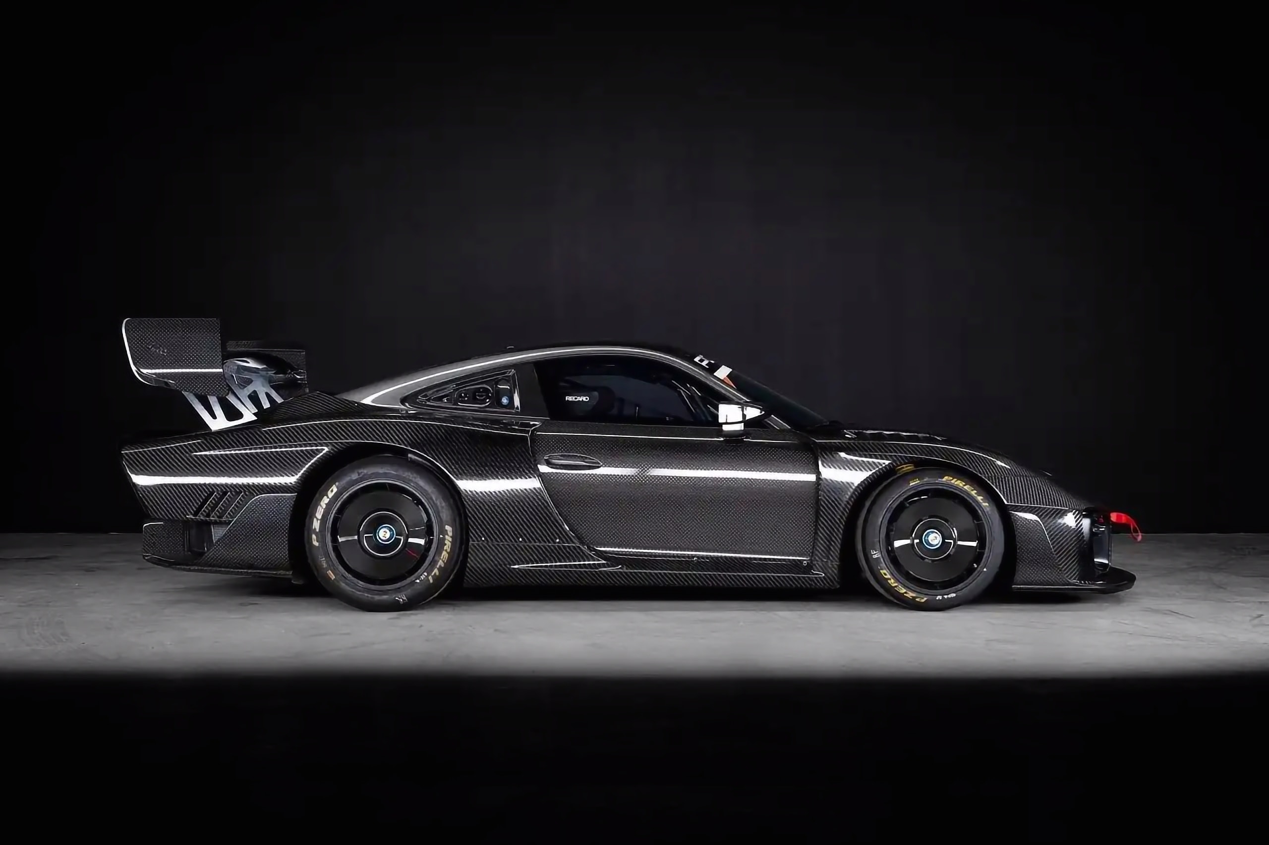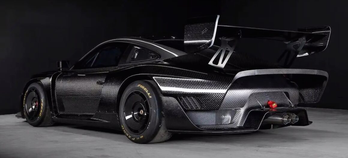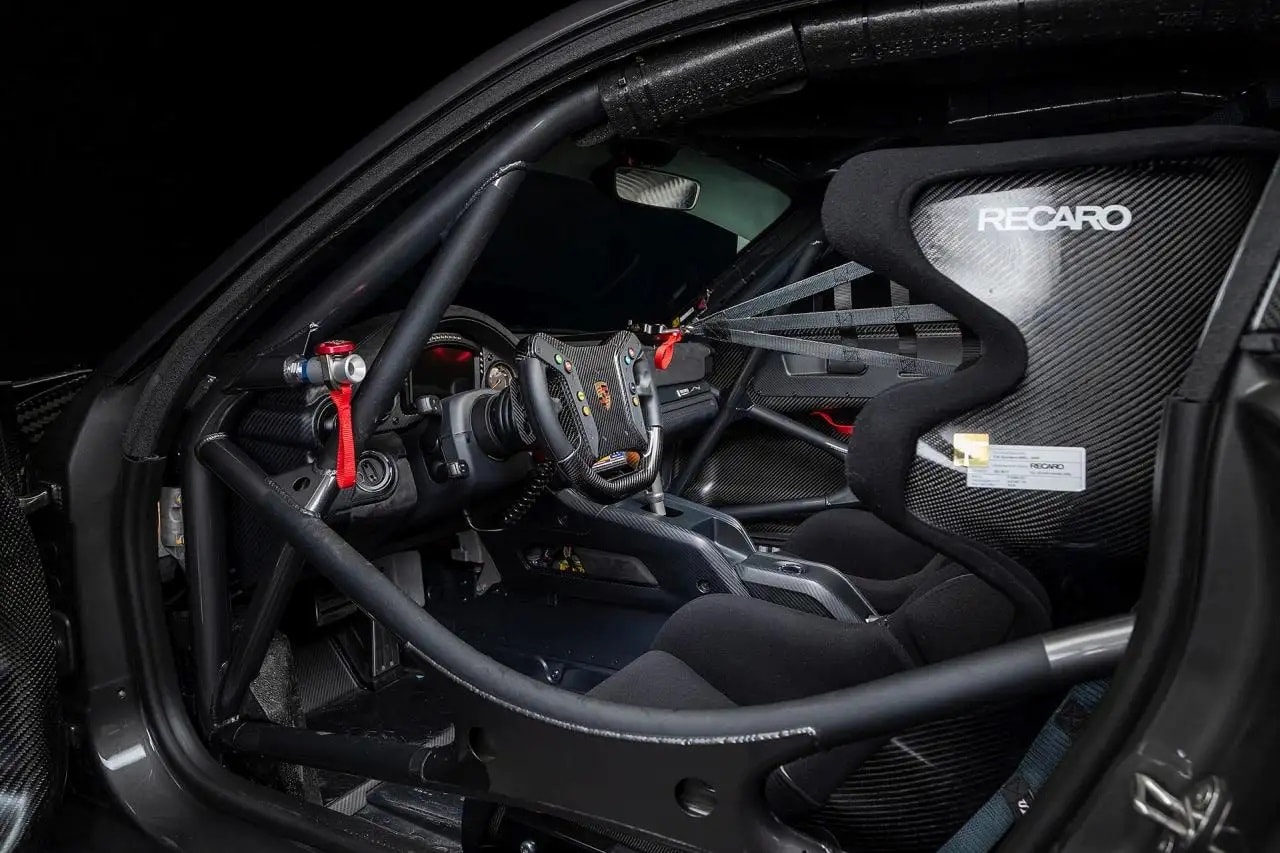 Quoi d’autre ? Des persiennes d’ailes, une trappe d’évacuation dans le toit en composite de fibre de carbone, des vitres latérales fixes, des rétroviseurs extérieurs partagés avec la 911 RSR, un diffuseur arrière, deux sorties d’échappement à l’emporte-pièce inspirées et sans doute récupérés d’une 908 et un aileron arrière réglable en fibre de carbone avec un habillage Porsche de chez Pfaff Motorsports à carreaux… Dieu que c’est laid voire hideux… Il y a aussi des feux LED intégrés dans les plaques d’extrémité. Comme pour les grues… Dieu, oui, je me repent avec courage, frappé au cœur par ce coup du sort… Les jantes en alliage forgé BBS mesurent 18×11,5 pouces à l’avant et 18×13 pouces à l’arrière, et elles sont finies en noir mat et fixées par des écrous centraux à code couleur. Des slicks Michelin Pilot Sport GT de 30/65 et 31/71 sont montés respectivement à l’avant et à l’arrière, et un jeu d’aérodisques en fibre de carbone est inclus dans la vente. Là encore, cet appel aux divinités extraterrestres indique la voie du mal céleste… Le système de freinage intègre des étriers monoblocs Brembo avec des disques à six pistons de plus de 380 mm, fendus (encore les sabots du diable) et ventilés à l’avant… et des disques à quatre pistons de plus de 355 mm à l’arrière. Notez que la polarisation avant-arrière peut être ajustée à l’aide d’une barre d’équilibre…