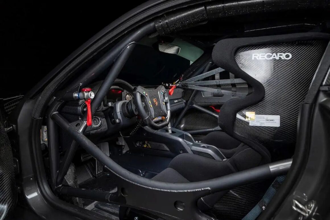 Ca vous en bouche un coin… Avouez… J’ajoute que les commandes électroniques permettent de régler ou de désactiver l’ABS, l’antipatinage et l’entrée électronique de stabilité. Avouez qu’un camion de pompier est plus amusant… Je suis tout remué de savoir tout cela… Que d’autres diableries sont-t-elles encore à y découvrir ? Le cockpit abrite des sièges de course Recaro avec des coques en fibre de carbone, une sellerie noire et des harnais Schroth à six points. L’équipement supplémentaire comprend un arceau de sécurité, un filet latéral, une garniture de tableau de bord en Alcantara noir, la climatisation, un système d’extinction d’incendie, des interrupteurs de coupure de carburant et électriques… C’est dingue… Les poignées de porte intérieures sont rouges, un réglage électrique des rétroviseurs extérieurs a été prévu et un levier de vitesses en titane avec un bouton en bois laminé semble offert alors que c’est une option de 10.000$… C’est totalement sidérant ! Ce dernier fait un clin d’œil à la Porsche 917… Sympa de le mentionner… Priez le saigneur et Maître ayant créé cette satanerie diabolique… Le volant en composite de fibre de carbone à dégagement rapide accueille des palettes de changement de vitesse et des boutons de commande pour le tableau de bord numérique Cosworth ICD…