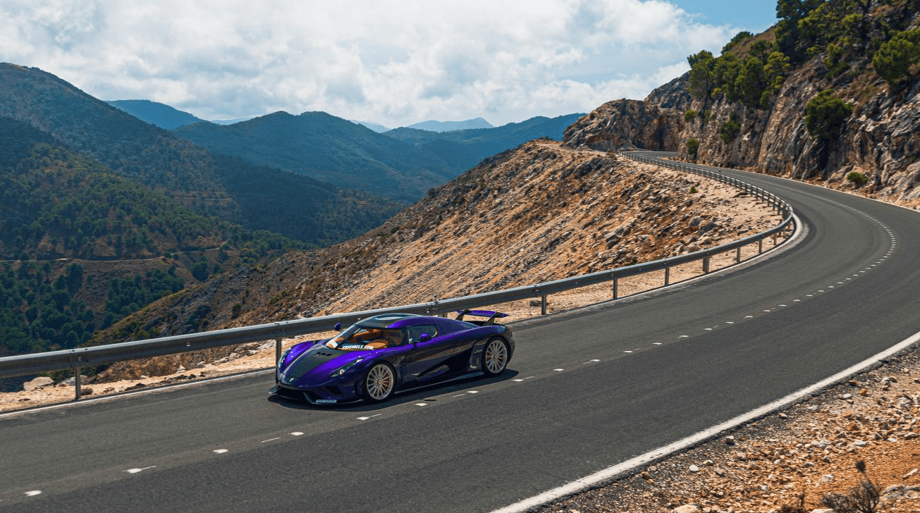Le lendemain matin, j’ai rencontré le propriétaire de la Koenigsegg Regera violette, qui avait accepté de me conduire dans les montagnes. Il n’a pas souhaité être nommé dans cet article, mais il a eu le plaisir de me permettre de le décrire en termes généraux : un homme d’affaires d’une quarantaine d’années qui partageait son temps entre Singapour et la Suisse. Dans la chaleur, il portait un short en lin blanc, un polo de couleur crème, des mocassins et des lunettes de soleil Louis Vuitton. Il s’est avéré être une compagnie sympathique, s’arrêtant parfois de discuter de ses passions, qui comprenaient le design de montres de luxe, pour traîner un stylo à vape rouge. Alors que nous rejoignions un convoi de la S.O.C. qui quittait l’hôtel, il m’a parlé de sa voiture. La Regera violette était l’une des trois Koenigseggs qu’il possédait. Il avait acheté celle-ci, pour trois millions de dollars en 2021. elle valait maintenant environ quatre millions. Les primes d’assurance sur les hypercars sont si élevées qu’il rend les plaques d’immatriculation de ses Koenigseggs pendant la majeure partie de l’année.