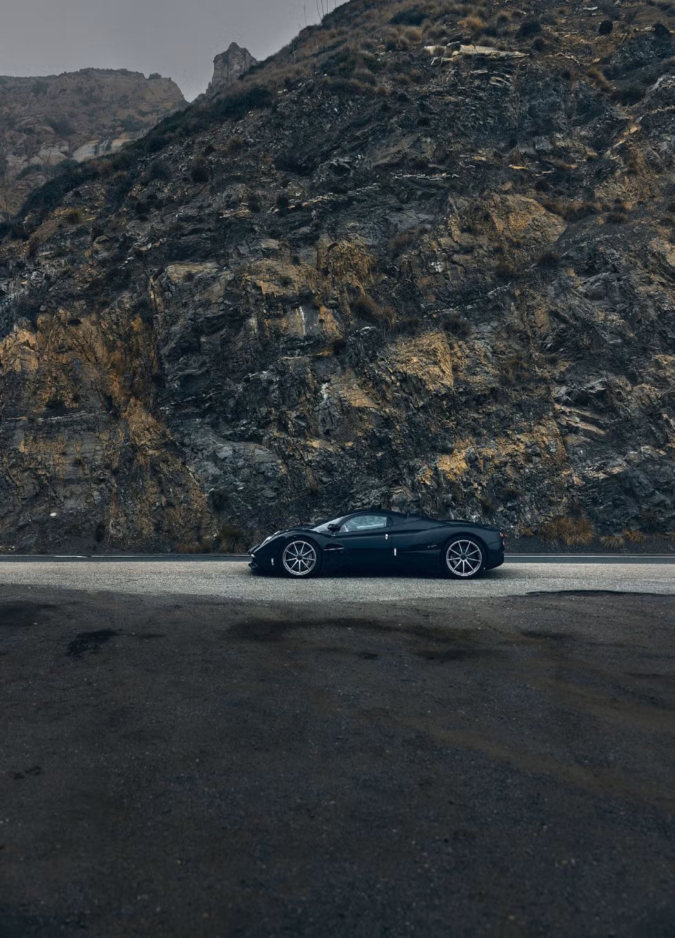 Les palettes de changement de vitesse utilisent un seul rocker, de sorte que vous pouvez monter ou descendre avec l’une ou l’autre main, comme dans une McLaren. Mais, contrairement à une McLaren, le mécanisme de rebond à ressort est en métal fraisé et poli, monté directement sur le dessus du volant pour que vous puissiez le voir fonctionner. La clé de l’Utopia, à peine plus grande qu’un vieux téléphone à clapet, est un modèle réduit de la voiture elle-même. Il a son propre berceau dans la console centrale, ce qui est génial car vous ne voulez pas que cette chose remplisse votre poche toute la journée. Je ne peux m’empêcher de penser que, tandis que Gordon Murray trouve de manière obsessionnelle des moyens de réduire de quelques milligrammes des pièces que ses clients ne verront jamais et que Christian von Koenigsegg réinvente des groupes motopropulseurs entiers, Horacio Pagani développe activement de nouvelles façons innovantes de rendre les voitures plus baroques. Et il y a un marché pour cela : les 99 Utopia Coupé et les 130 Utopia Roadsters sont épuisés. Au rythme actuel de production de Pagani de 50 à 60 voitures par an, il y a environ quatre ans d’attente si vous faites la queue maintenant. En supposant que le prix d’achat n’est pas un choc, rien dans la conduite d’une Utopia n’est particulièrement emballant. Elle est large mais pas intimidante, elle a une bonne visibilité (même la lunette arrière ridiculement petite est placée au bon endroit), et il n’a pas de mauvaises habitudes. La bête fait ce qu’on lui dit de manière responsable et prévisible.