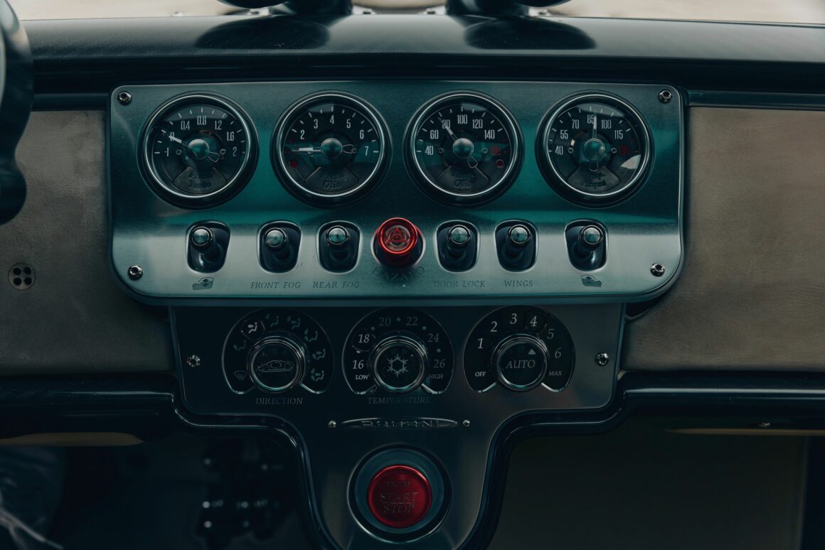 Il y a des notes d’un technicien à un autre, des flèches directionnelles dessinées à la main sur les pièces pour indiquer “en haut” ou “devant”. Pour autant que je sache, l’Utopia est la seule voiture en vente avec des éléments extérieurs en cuir, un quatuor de sangles qui servent d’attaches de sécurité pour les coques avant et arrière. Pagani fournit des extras, car les sangles sont des pièces d’usure, bien entendu… Le volant est fraisé à partir d’un seul bloc d’aluminium. Il n’y a pratiquement pas de bords durs et peu de surfaces planes sur une Utopia qui n’est donc pas une hypercar ordinaire. Presque tout a une courbe, en particulier la carrosserie, qui est moulée autour des morceaux durs comme si elle avait été scellée sous vide. Il est difficile de ne pas être complètement submergé. S’agit-il d’une voiture ou d’un salon de cigares italien ? Le sol est recouvert de cuir. Le volant est fraisé à partir d’un bloc d’aluminium. Les bouches d’aération dépassent du tableau de bord comme les cuivres d’un orchestre. Il y a une superbe tringlerie de levier de vitesses exposée, en métal apparement solide, faite uniquement pour le plaisir, car cette voiture est équipée d’une transmission automatisée à embrayage unique à sept vitesses. Le compteur de vitesse et le tachymètre sont entraînés par des engrenages visibles qui, s’ils ne bougent pas réellement les aiguilles, se trouvent de manière convaincante. Vous contrôlez le CVC avec seulement trois boutons simples, mais ces boutons sont de beaux petits morceaux de sculpture en eux-mêmes, incorporant des anneaux d’affichage en verre.