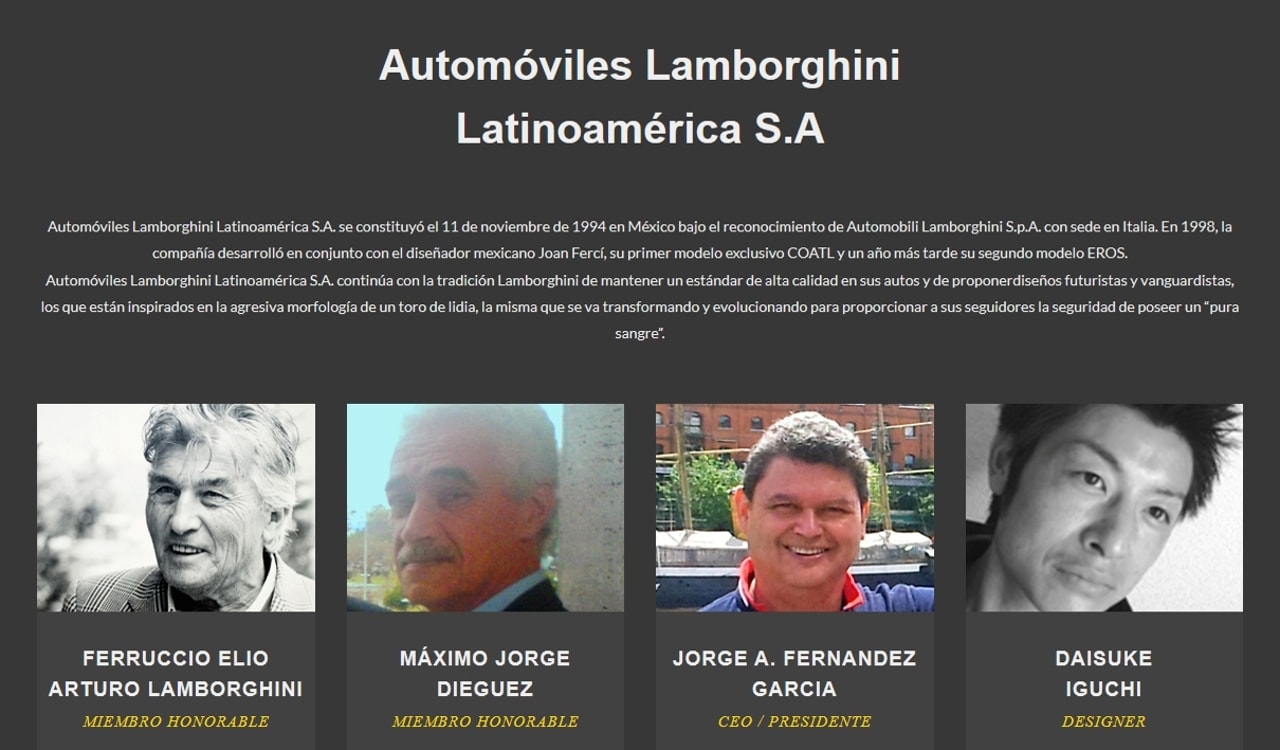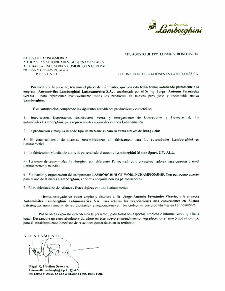 – “Robert Braner, qui était le président de Lamborghini-USA, et Michael Kimberley, président de Lamborghini-Italie, ont signé avec moi un contrat net et précis, 100% légal m’autorisant à fabriquer et commercialiser des Lamborghini à destination de l’ensemble de l’Amérique Latine pour une période de 99 ans… L’Amérique du sud et particulièrement le Mexique représentaient un marché qui n’intéressait pas les gringos et il n’y a donc eu aucun problème pour arriver à cet accord contractuel afin que je possède irrévocablement les droits de la marque pour l’Amérique latine pour 99 ans. A cette époque, j’ai vendu 23 Lamborghini Diablo, 20 aux États-Unis et trois en Italie par retour…, les photocopies des documents, contrats et accords en anglais, se trouvent sur mon site Internet www.lamborghini-latinoamerica.com”…