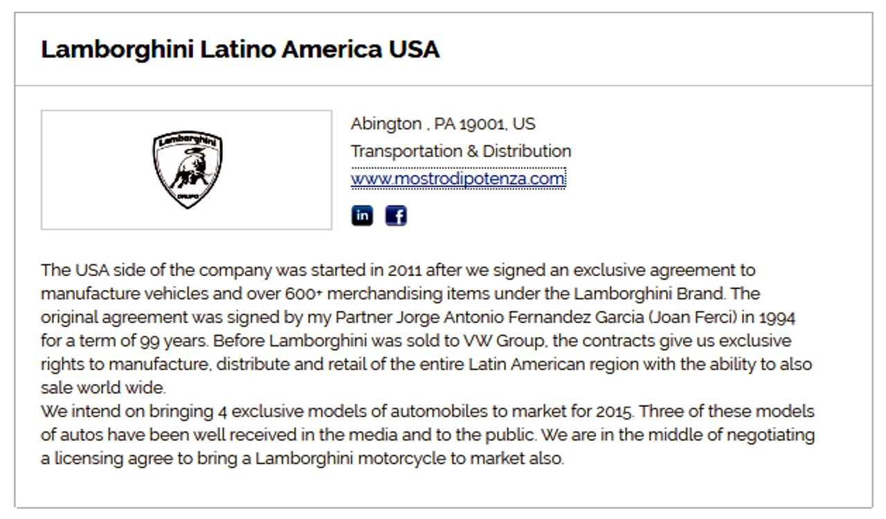 Durant notre enquête investigatrice, au siège Lamborghini de Sant’Agata Bolognese (Italie), la responsable de la communication de la marque a assuré ignorer l’existence de Joan Fercí et son prolongement/utilisation du nom de Lamborghini ne fusse que via les annonces de la création d’une usine Lamborghini LatinoAmérica en Argentine où en Uruguay…, révélant toutefois, en esquive, être en négociations avancées pour nommer un importateur officiel de Lamborghini en Argentine…