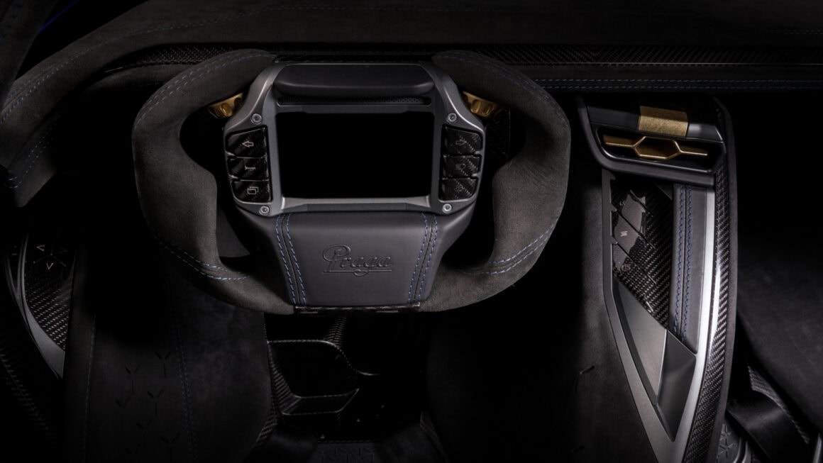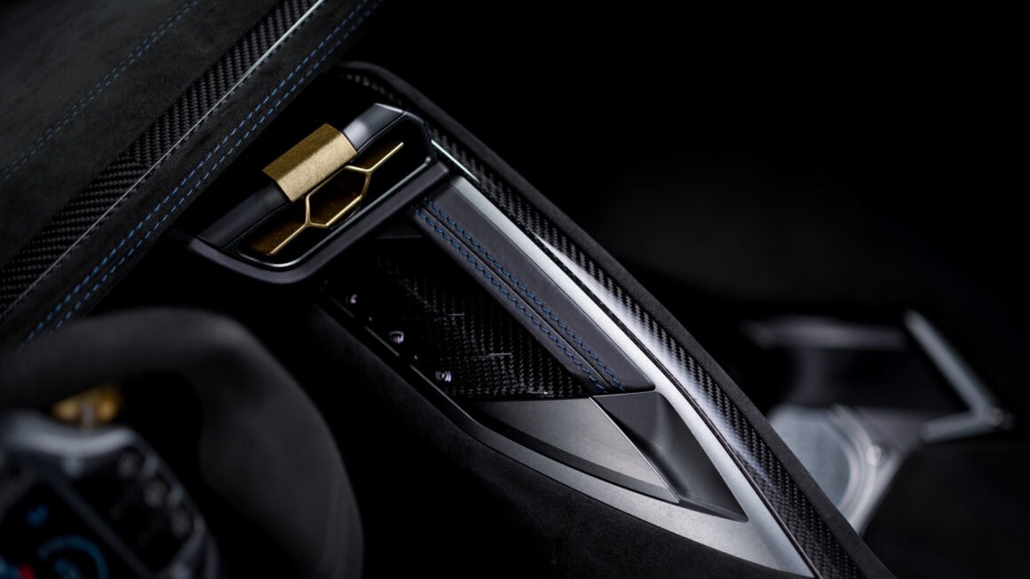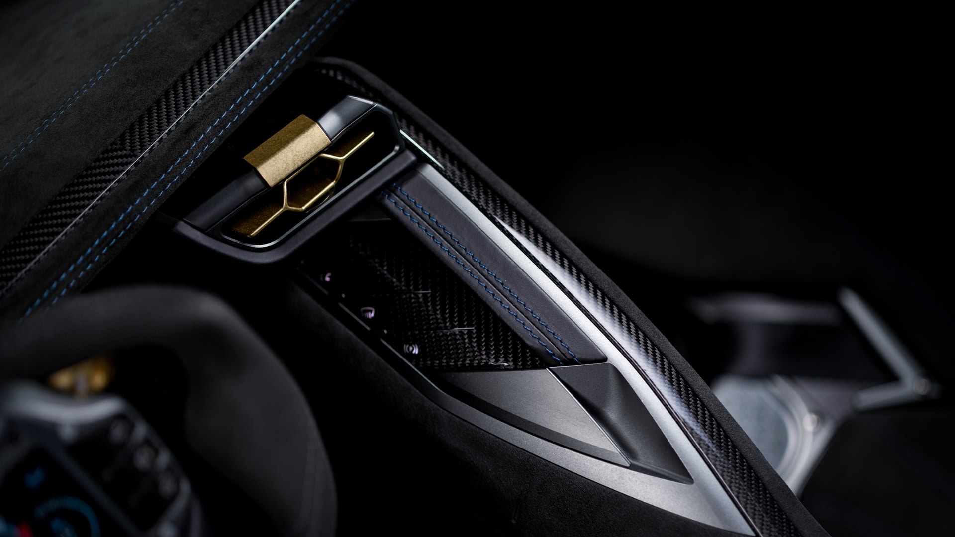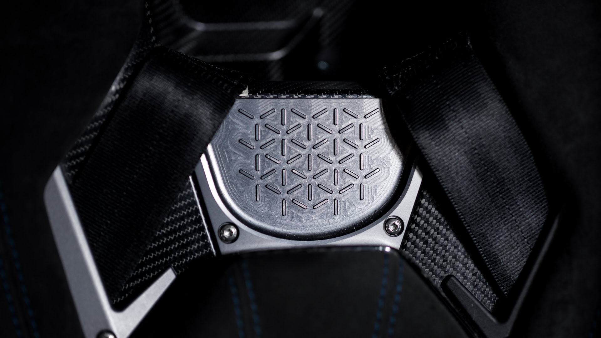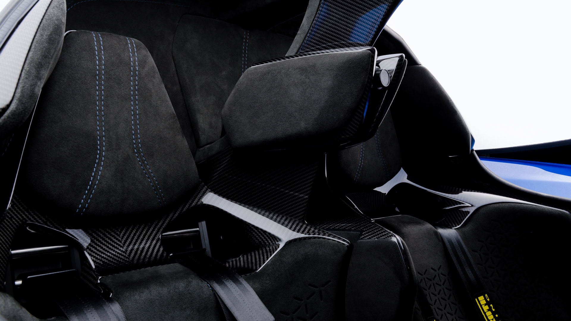 Oui, mais, en usine, car tout se règle avec des boulons et tiges nécessitant plus d’une heure de travail minutieux… Le Launch Control et le frein de stationnement électronique sont activés depuis la console centrale élancée. De chaque côté du cockpit se trouvent les commandes électroniques de déverrouillage des portes (complétées par des commandes mécaniques dans le toit) et les commandes des rétroviseurs, tandis que les commandes de climatisation sont montées sur la console de toit de style “avion de chasse”, les bouteilles et des objets divers se positionnant derrière les sièges horizontaux.