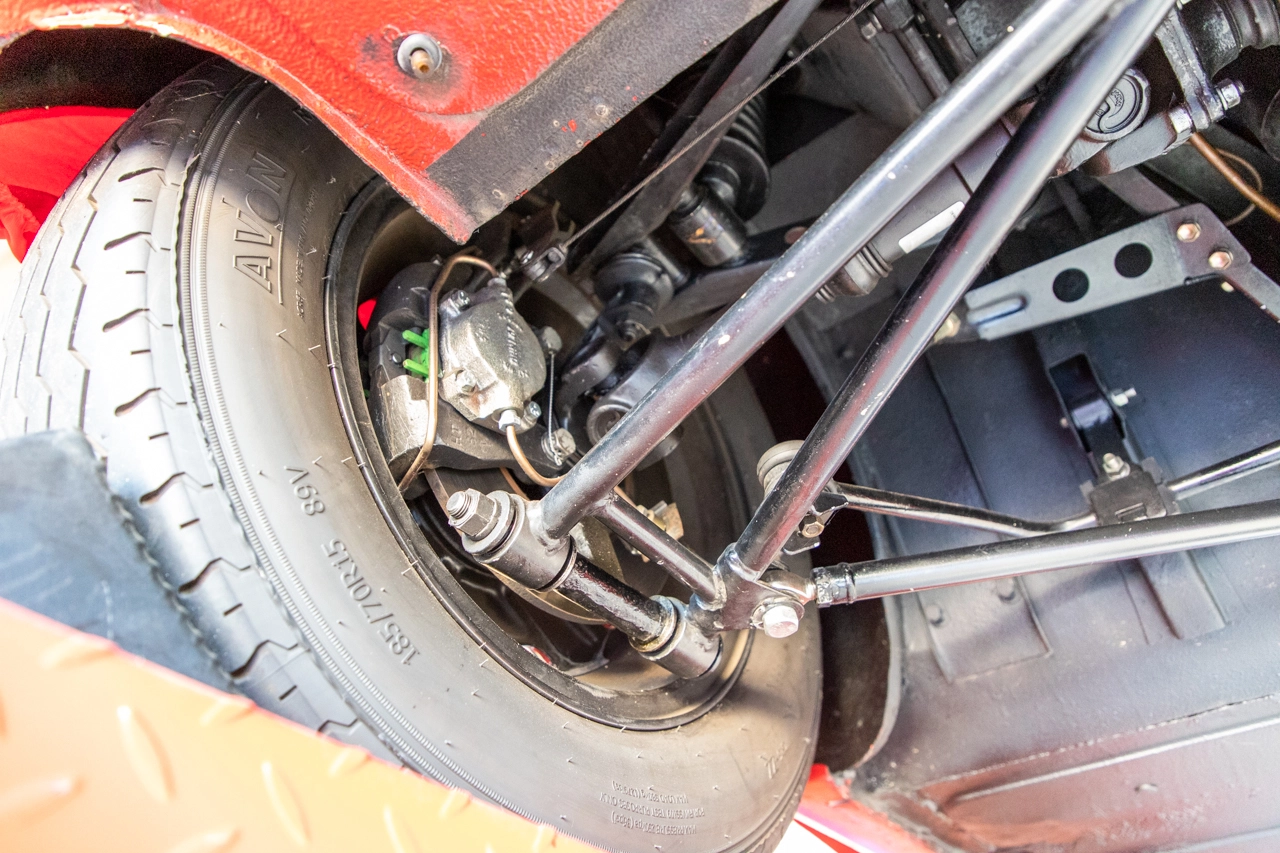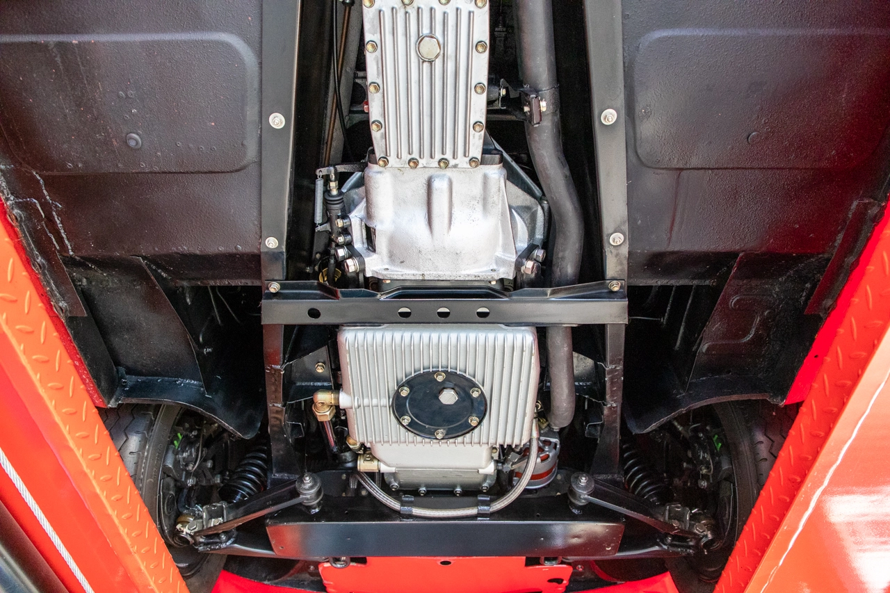 Le double échappement central était également très évocateur et très réussis, mais dans les détails plus amusants encore et qui replaçaient l’auto dans son époque, admires les petits rétroviseurs obus qui placés sur les ailes avant. Au passage, leur efficacité était quasi-nulle et il convenait de les apprécier plus pour l’esthétisme que pour leur réel intérêt sécuritaire. Près des roues avant sur les flancs il existait deux trappes. Celle de gauche cachait le filtre à air et celle de droite la batterie ! Cela reprenait un peu le principe des Bristol Blenheim anglaises qui dissimulaient au même endroit leurs 2 roues de secours !