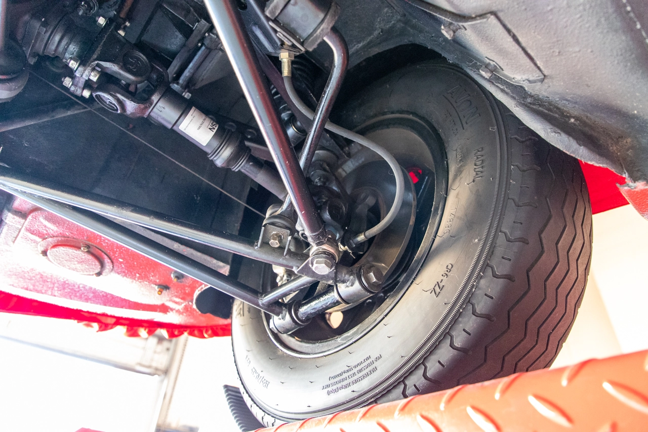 Pour parvenir à un résultat qui leur paraissait suffisamment satisfaisant, ils ont conçu un cadre à caissons avec traverses, dont la partie arrière était allégée par perçage. C’était donc une structure avec châssis séparé qui était ensuite assemblée avec une coque en acier. La Toyota 2000 GT héritait de quatre roues indépendantes avec à l’avant et à l’arrière des solutions encore reprises de la compétition : leviers triangulaires en trapèze transversaux, ressorts hélicoïdaux, amortisseurs télescopiques et barres stabilisatrices. Ajoutons à cela les jantes Yamaha en Magnésium qui diminuaient le poids non suspendu.