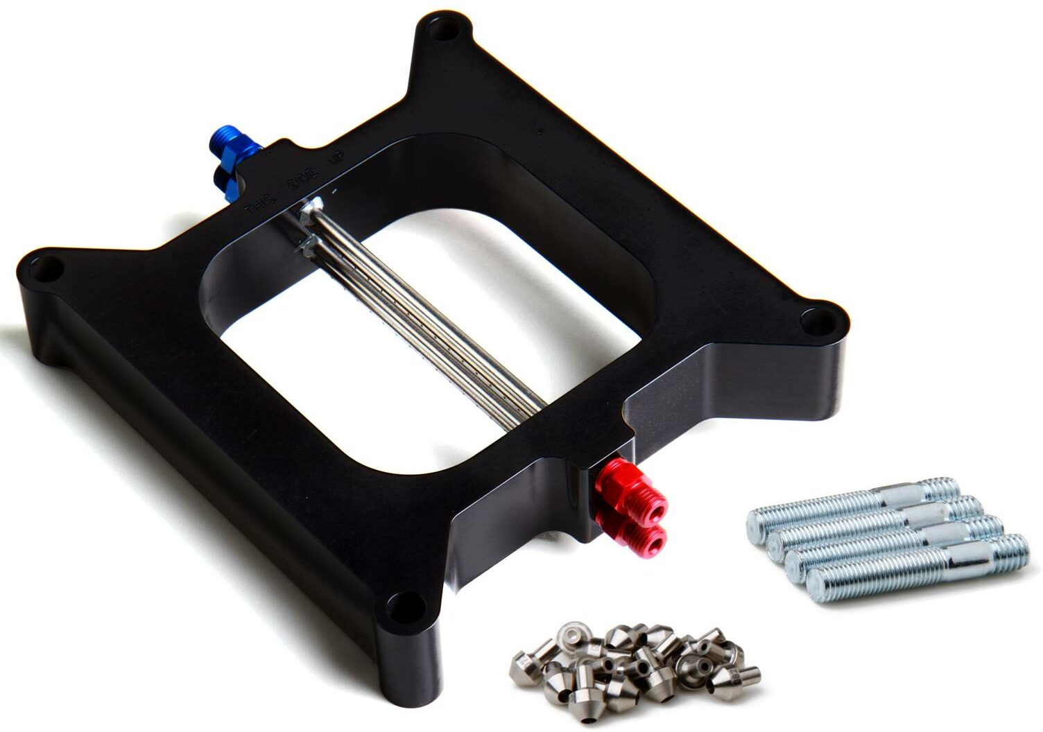 Cela se traduit par une augmentation substantielle de la puissance qui est instantanément activée. Les systèmes d’injection de protoxyde d’azote à sec sont les plus simples : ils injectent uniquement du protoxyde d’azote dans l’admission, le carburant étant géré séparément par un réglage spécifique du carburateur ou du calculateur moteur (pour les systèmes à injection électronique). Les systèmes à injection “humide”, quant à eux, introduisent simultanément le protoxyde d’azote et le carburant par la même buse ou plaque. Le rapport protoxyde d’azote/carburant étant contrôlé par le système lui-même, une configuration à injection “humide” offre une plus grande flexibilité de réglage et réduit la nécessité de modifier le dosage du carburant lorsque le système n’est pas utilisé. C’est pourquoi la plupart des configurations courantes, comme les systèmes à buse unique, dits “à plaques” pour carburateur(s) ou à injection directe, sont conçues comme des systèmes à injection “humide”. Quel que soit le système utilisé, l’injection de protoxyde d’azote augmente l’apport d’oxygène dans la chambre de combustion, ce qui accroît la consommation de carburant et la pression dans les cylindres.
