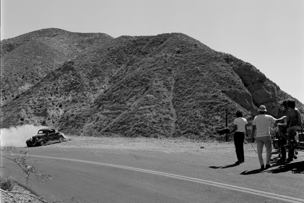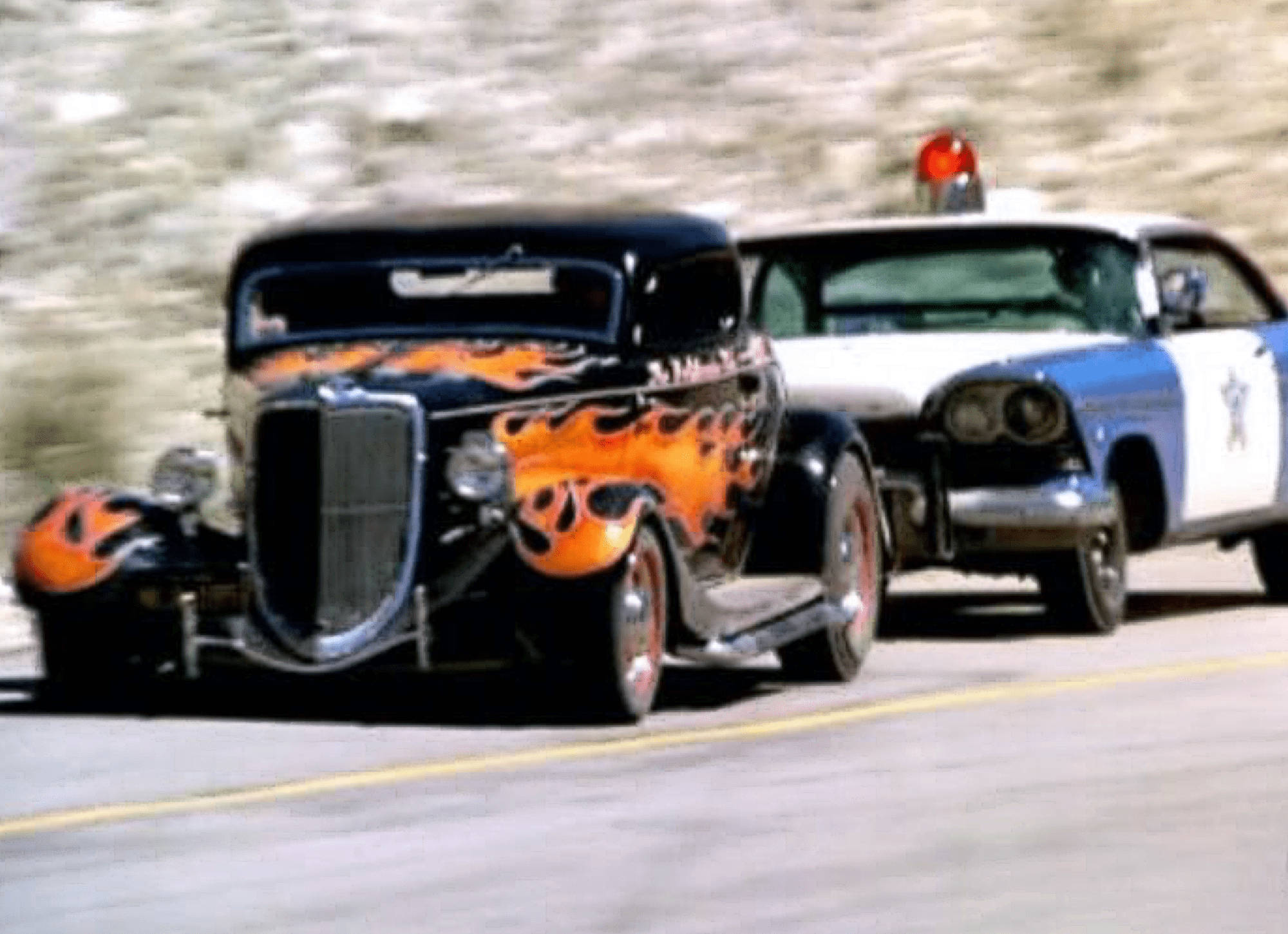 Juste au moment où ils traversent un tunnel sur la route à 2 voies, le shérif Roy sort de sa cachette dans sa Plymouth bleue et blanche, une boule de gomme rouge vif virevoltant sur le toit, dans la première de plusieurs poursuites en voiture qui font crisser les pneus, avant de “nerfer” la Ford hors de la route là ou est indiqué “Slow to 30 Dangerous Curve” et eux, comme les autres, dégringolent de la colline jusqu’à leur mort. Le shérif recule, sort, se tient au bord de la falaise, les mains sur les hanches et secoue la tête… Pffffff ! La scène suivante, sur la musique du générique d’ouverture et le générique du titre, se présente la star du film. Non, pas le California Kid qu’est Martin Sheen (alias Mike McCord), mais son coupé de 1934, au toit Top Choppé et aux flammes sauvages…