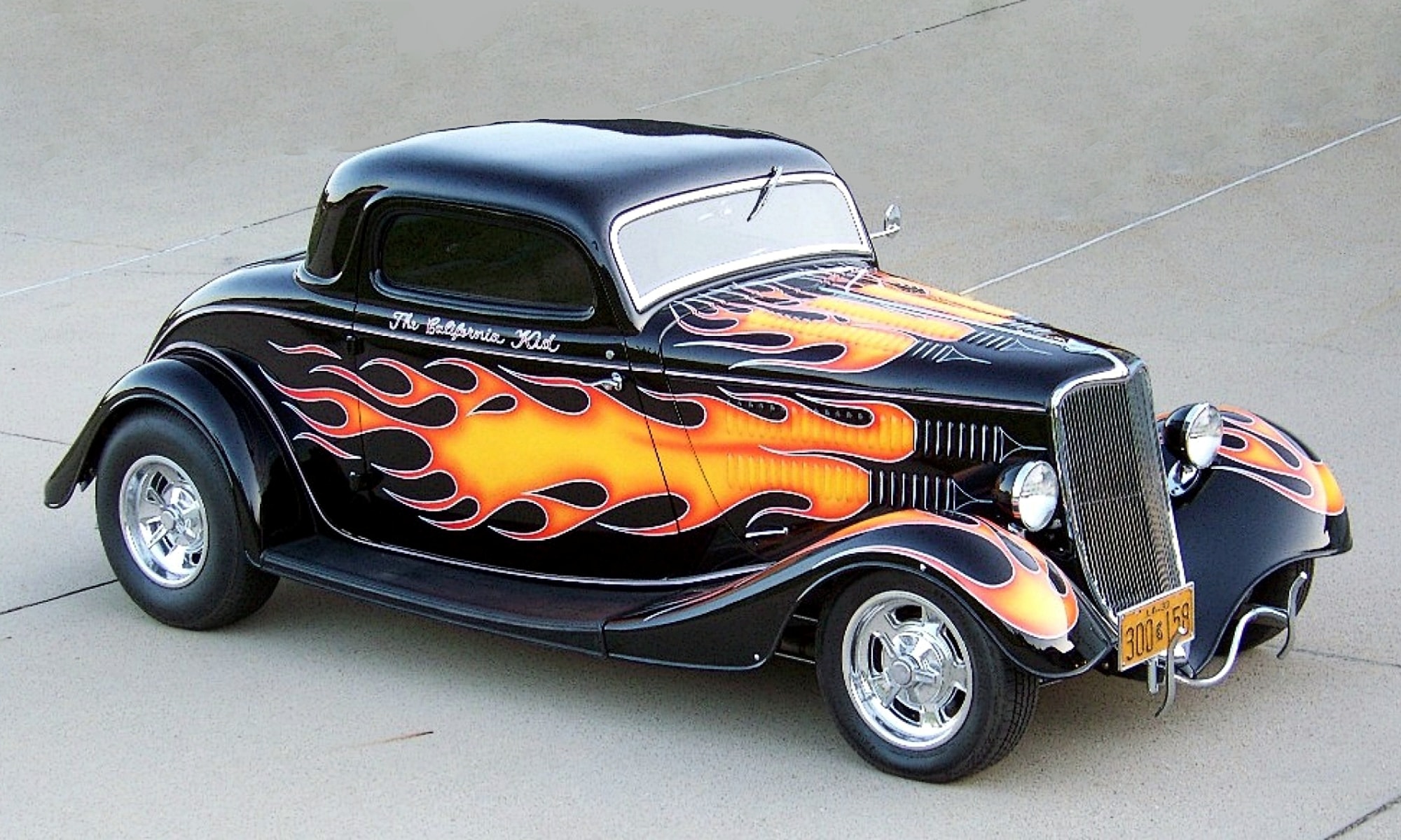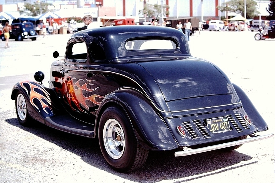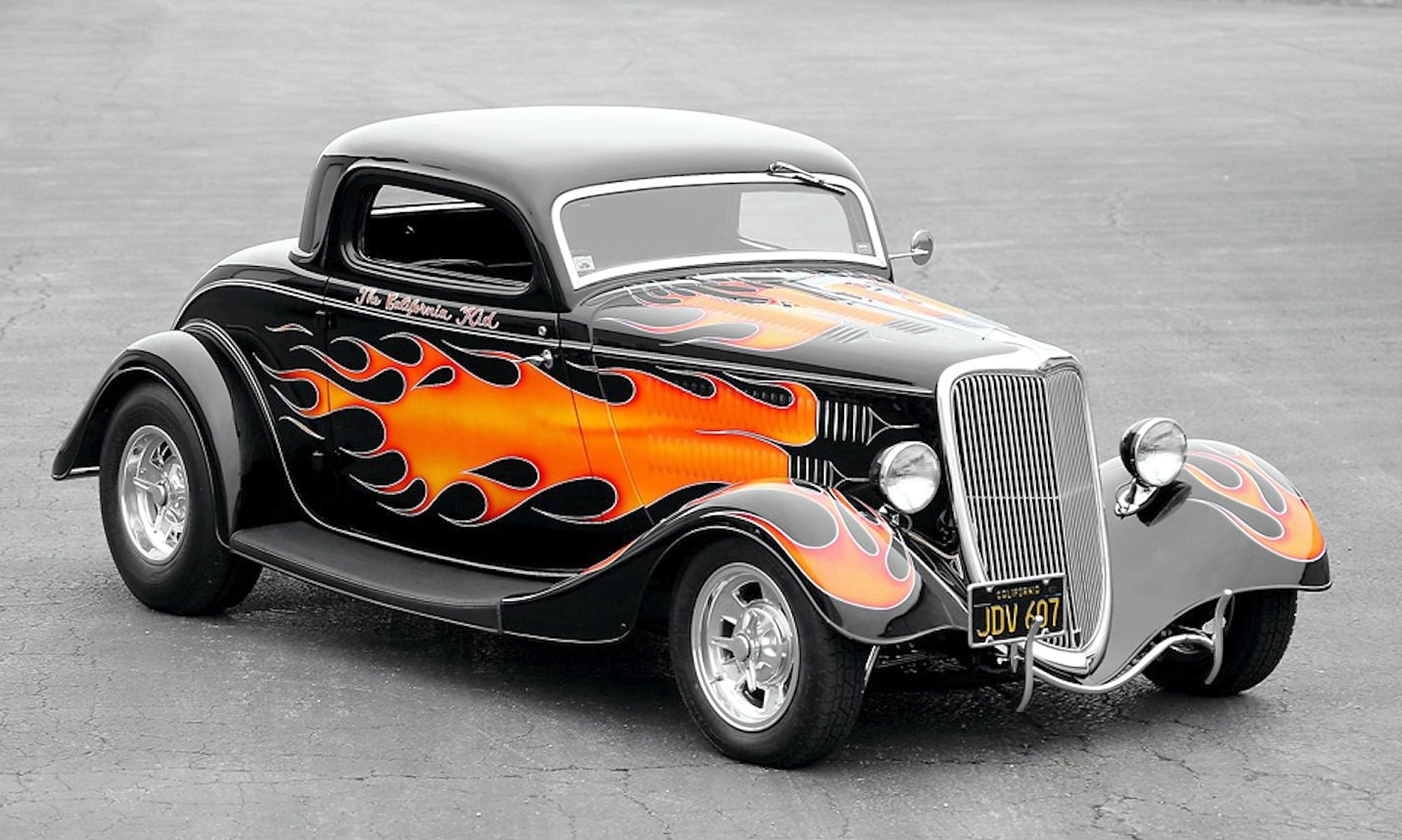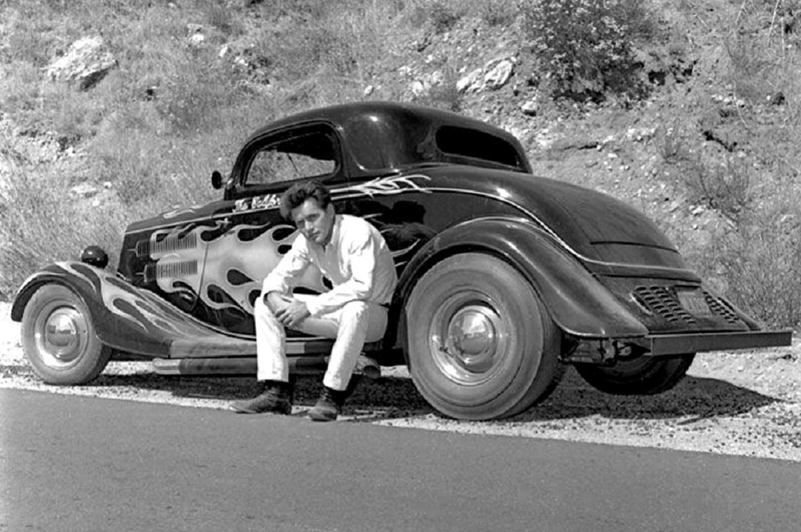 Pete Chapouris, le constructeur du Hot-Rod “The California Kid” (à qui l’on doit aussi celui de “American graffiti”) est né le 16 décembre 1942. Élevé dans la banlieue de Los Angeles, il a commencé à personnaliser des voitures dès ses 15 ans en’ 57. Après avoir travaillé à la fois comme technicien en dynamométrie et soudeur, Chapouris a connu un grand succès lorsque son coupé Ford 34 enflammé a été publié en couverture de novembre 1973 du magazine américain Rod&Custom, une mise en scène dans une ferme, aux côtés de la Ford jaune à deux portes de Jake Jacobs, entourée d’animaux en train de paître, c’était audacieusement estampillé : “Les coupes sont-elles pour les poulets ?”, l’image de couverture est devenue un classique instantané.