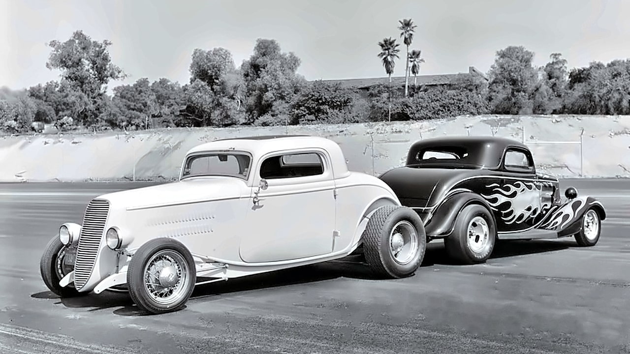 Depuis 1986, ça fait donc 35 ans puisque j’écris cet article en février 2024, “The California Kid” appartient à Jerry et Jason Slover… Ce sont également les propriétaires de Pete & Jakes, également acheté en 1986, et c’est de même que le coupé Ford ’34 distinctif (il est jaune) de Jim “Jake” Jacobs. Donc toute la légende, c’est du passé, le business efface tout et les gens, mêmes emblématiques avec leurs oeuvres, trépassent… Le film, “The California Kid”, était un film TV pas un film cinéma, sorti en 1974 à peu près au moment où le coupé’34 était en cours de finition. Au moment où le film a été tourné, l’intérieur du “California Kid” n’était pas terminé et son V8 était un small… bloc. Mais pour les gros plans si vous ne vous souvenez pas allez voir la Vidéo ci-dessus.