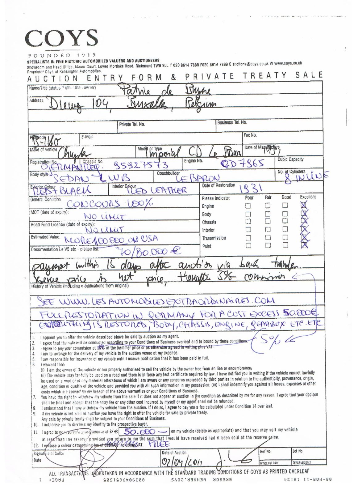J’aurais du en rester là…, Confier des voitures de collection dans ces conditions assez floues et précaires, quelle qu’en soit leur valeur, génère une angoisse qui devient un stress insupportable… Tout tient à rien d’autre que des bonnes paroles, car en matière de contrat, il se limite à un Entry-Form au nom de Coys, avec des conditions générales exclusivement en faveur de Coys-Angleterre, alors que les ventes se font off-shore en dehors du Royaume-Uni d’Angleterre… sans aucune garantie de suivi… tel que j’allais le découvrir suite à la vente de Essen en début 2011…