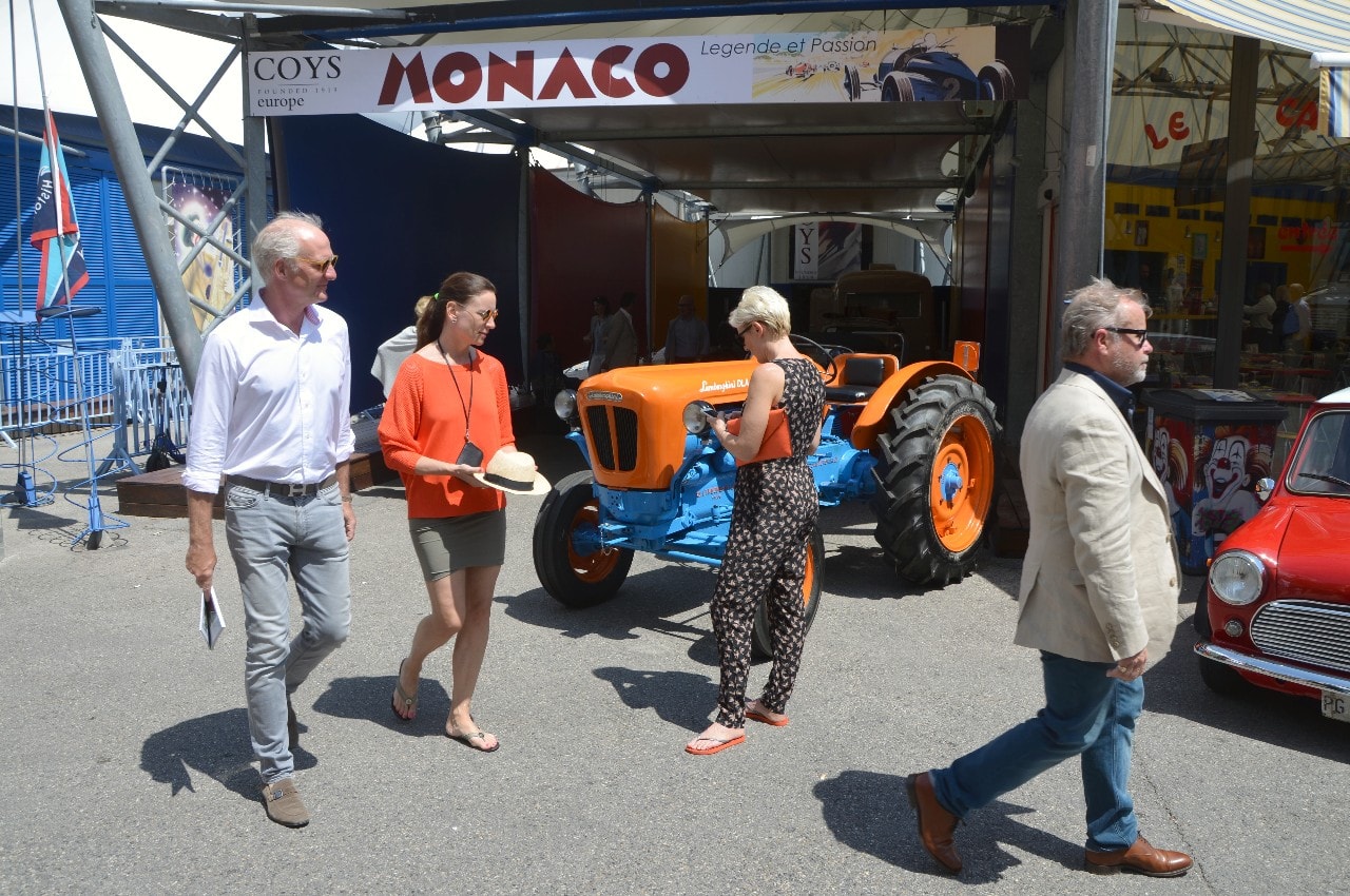 A l’entrée du cirque, d’un coté un tracteur Lamborghini, petit, minus, riquiqui, moche… De l’autre un bateau en bois (Riva ?) qui fait de l’ombre à une Shelby bleue qui a été parquée là par un opportuniste… Sous le chapiteau du Cirque, nommé “Espace Fontvieille”, la vente a commencé peu avant 10h, l’ambiance est sombre, les gens aussi, y a du glauque dans l’air… Les larbins guettent l’arrivée éventuelle d’un huissier venant réclamer le produit d’une vente précédente au nom d’un client du bout du monde, tandis que Chris Routledgele, le nouveau Boss, commissaire-priseur-président, préside en ânonnant en anglais, avec traduction abrégée simultanée d’une jeune dame…