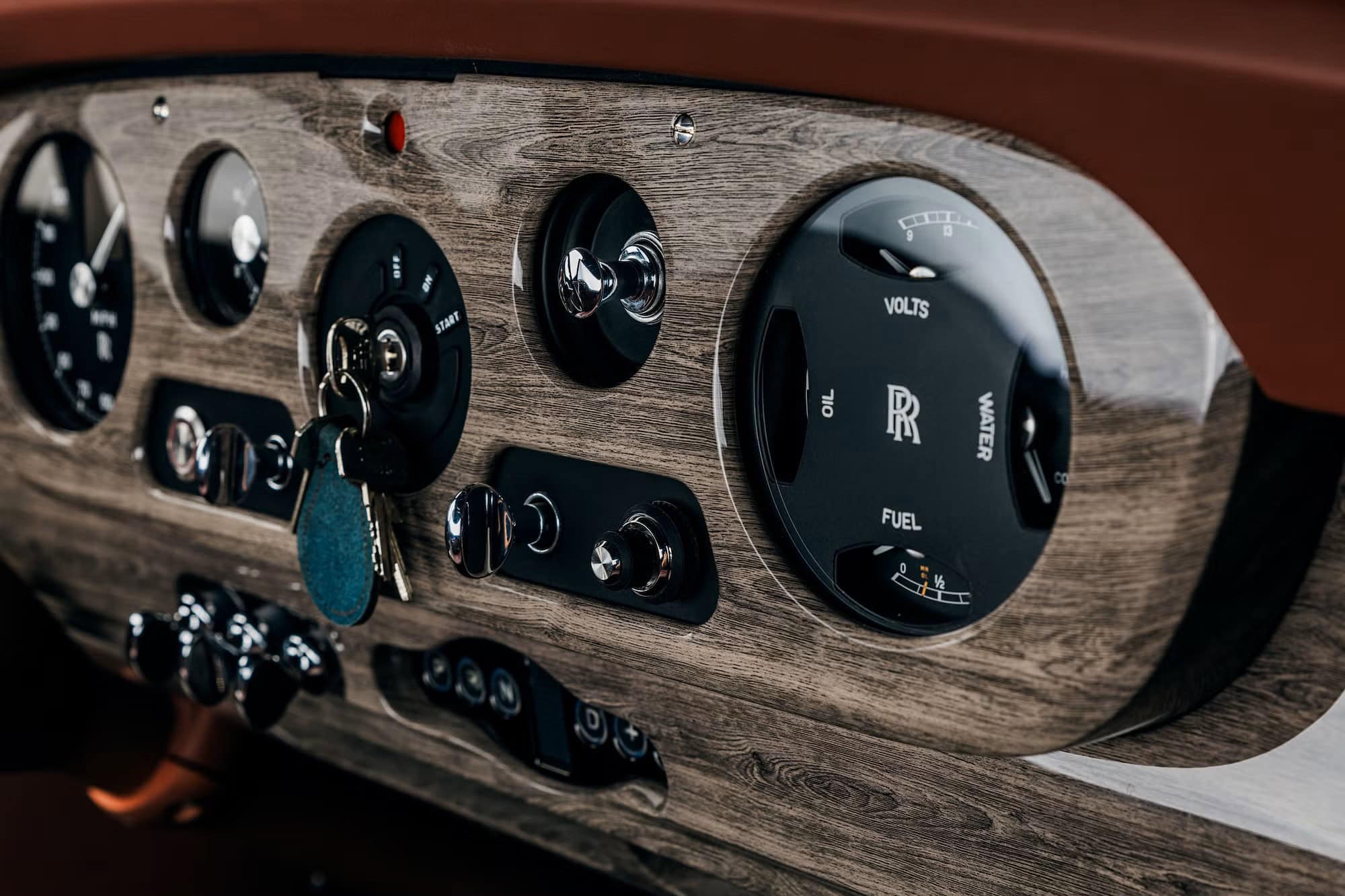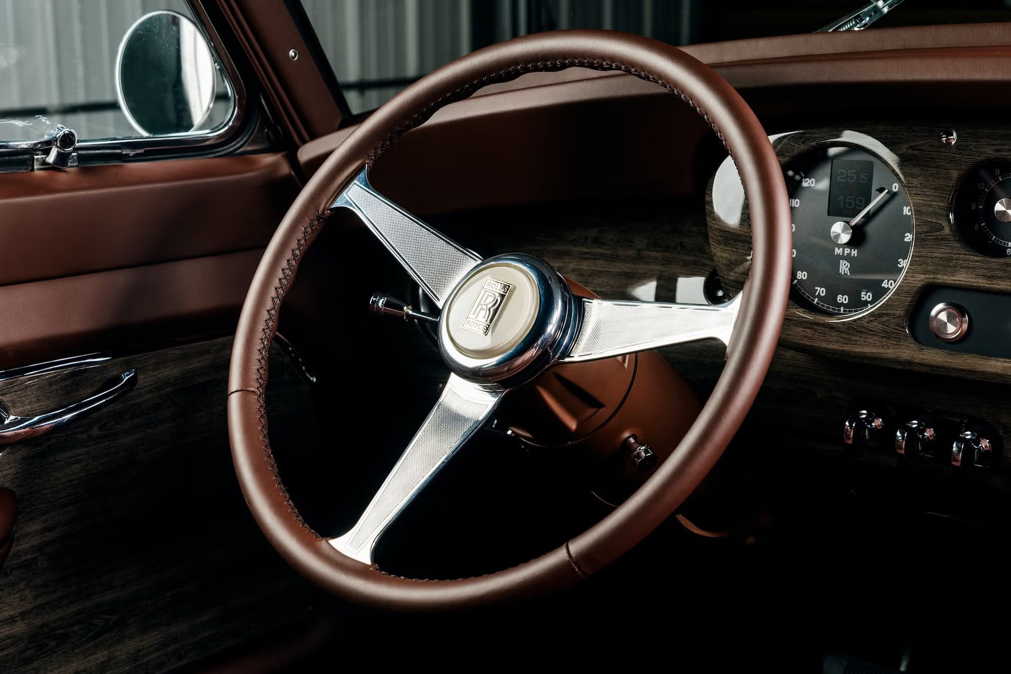 Ca tourne par le biais d’un arbre de transmission en carbone. Un ensemble de disques Baer Brakes de 15 pouces avec des étriers à six pistons permet de très bons freinages. Ils sont dissimulés par un ensemble de jantes EVOD Industries de 18 pouces avec des capuchons gyroscopiques. L’intérieur de n’importe quelle Rolls-Royce est toujours un endroit à visiter…, mais c’est particulièrement vrai pour cette pièce unique. Les Ringbrothers ont travaillé avec Sean Smith Designs pour recréer complètement l’espace, avec un magnifique travail du cuir et des détails en bois plus modernes.