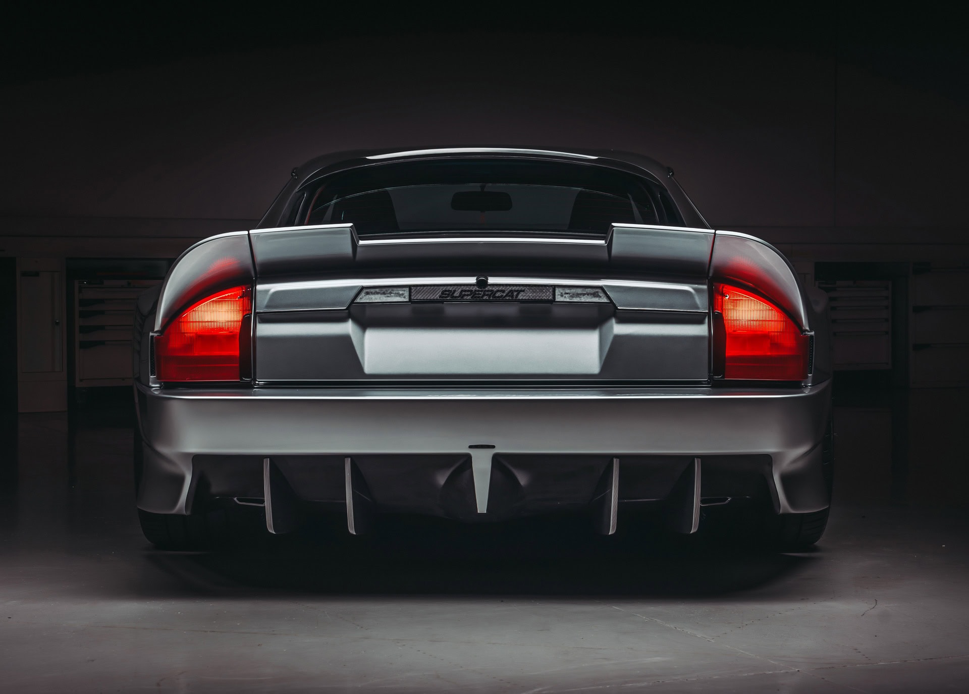 La Supercat devait à l’origine être une restomod soigneusement nettoyée et améliorée en utilisant la XJ-S comme donneuse. Magnus Walker, basé à Los Angeles, mieux connu pour ses Porsche’s Urban Outlaw, a agi en tant que consultant en design. “Le cahier des charges était très ouvert” m’a déclaré Saleem : “J’avais beaucoup de liberté pour travailler avec le design original et le développer, mais tout sur la voiture devait être fonctionnel”... La prise d’air inversée sur le capot, par exemple, est là pour fournir un espace libre au nouveau système d’admission ; les ailes gonflées sont nécessaires pour couvrir les roues plus larges et l’augmentation de la voie ; le becquet arrière en queue de canard crée une force d’appui sur l’essieu arrière. Les montants C qui étaient l’aspect le plus controversé de la XJ-S originale sont désormais de véritables arcs-boutants.