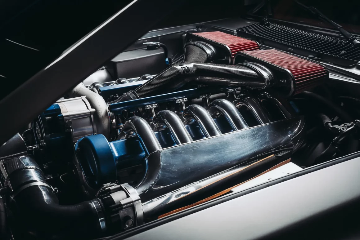 Il est ensuite reconstruit avec des culasses réusinées, de nouveaux pistons et bielles, de nouveaux arbres à cames et un nouveau système de distribution qui pèse 2 kg de moins que l’original. Le système d’induction sur mesure comprend deux filtres à air près du capot qui alimentent un collecteur d’admission en fibre de carbone menant à un compresseur centrifuge Rotrex monté dans la vallée à l’avant du moteur. Le V-12 modifié par TWR, dont 11 exemplaires ont été construits et testés pendant le programme de développement, produit 660cv à 6 600 tr/min et 538 lb-pi de couple à 5 400 tr/min. La transmission manuelle à six vitesses est une Tremec Magnum modifiée. Cette version robuste et fiable du TR-6060 utilisée dans les Dodge Challenger Hellcat et Viper, ainsi que dans la Chevrolet Camaro, peut supporter jusqu’à 700 lb-pi de couple. La décision d’opter pour une transmission manuelle était une évidence…