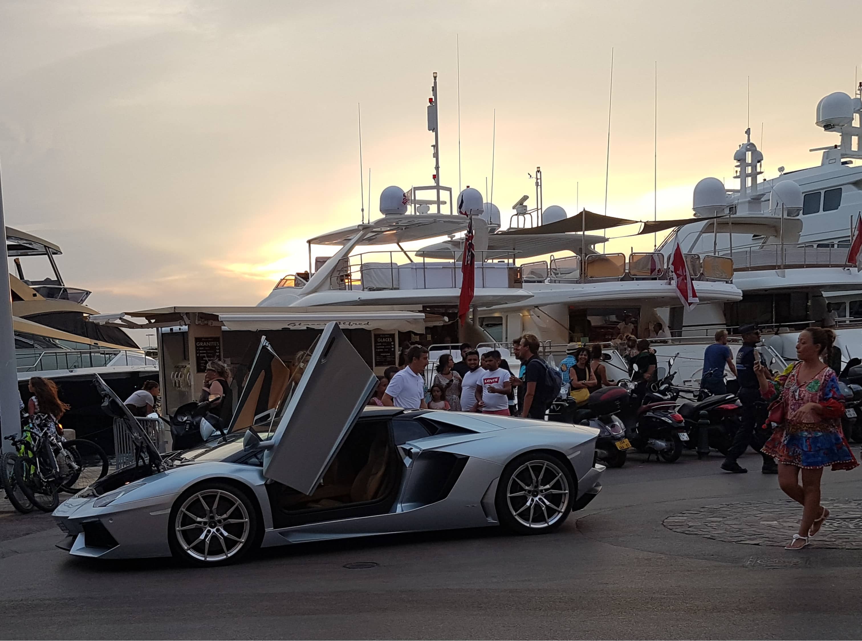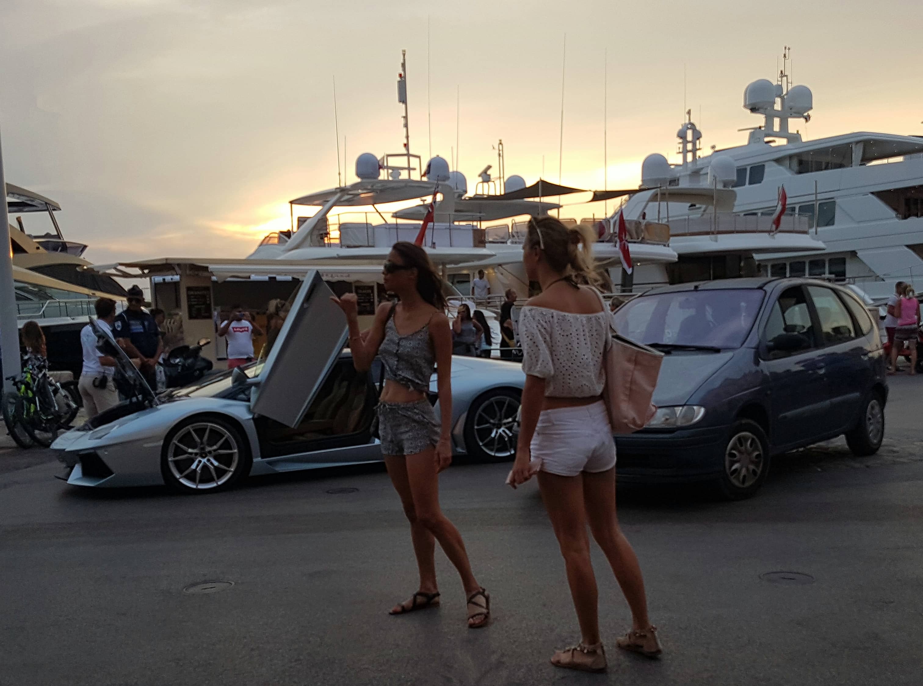 Il y avait justement une Lamborghini sur le port, amenée par le larbin de sévices du propriétaire (ou locataire à la semaine) d’un yacht imposant devant lequel les touristes s’agglutinaient comme des mouches… en attente de son propriétaire (peut-être locataire saisonnier) et de “sa blonde”…
