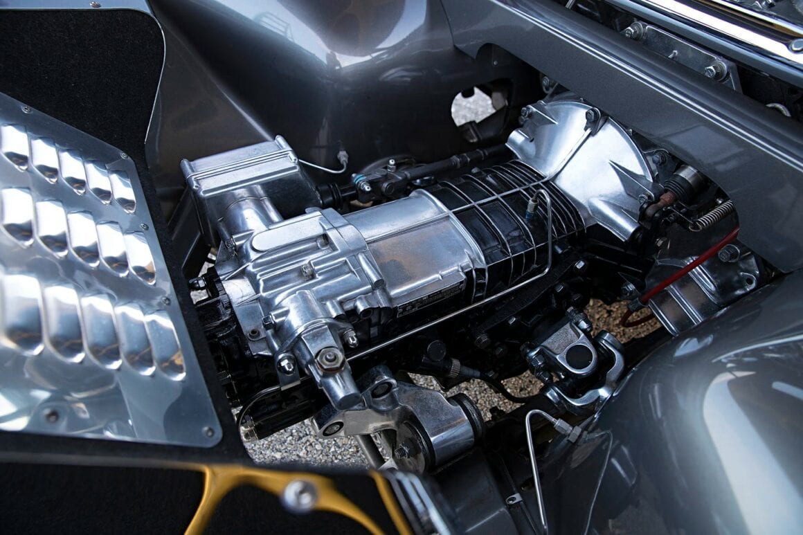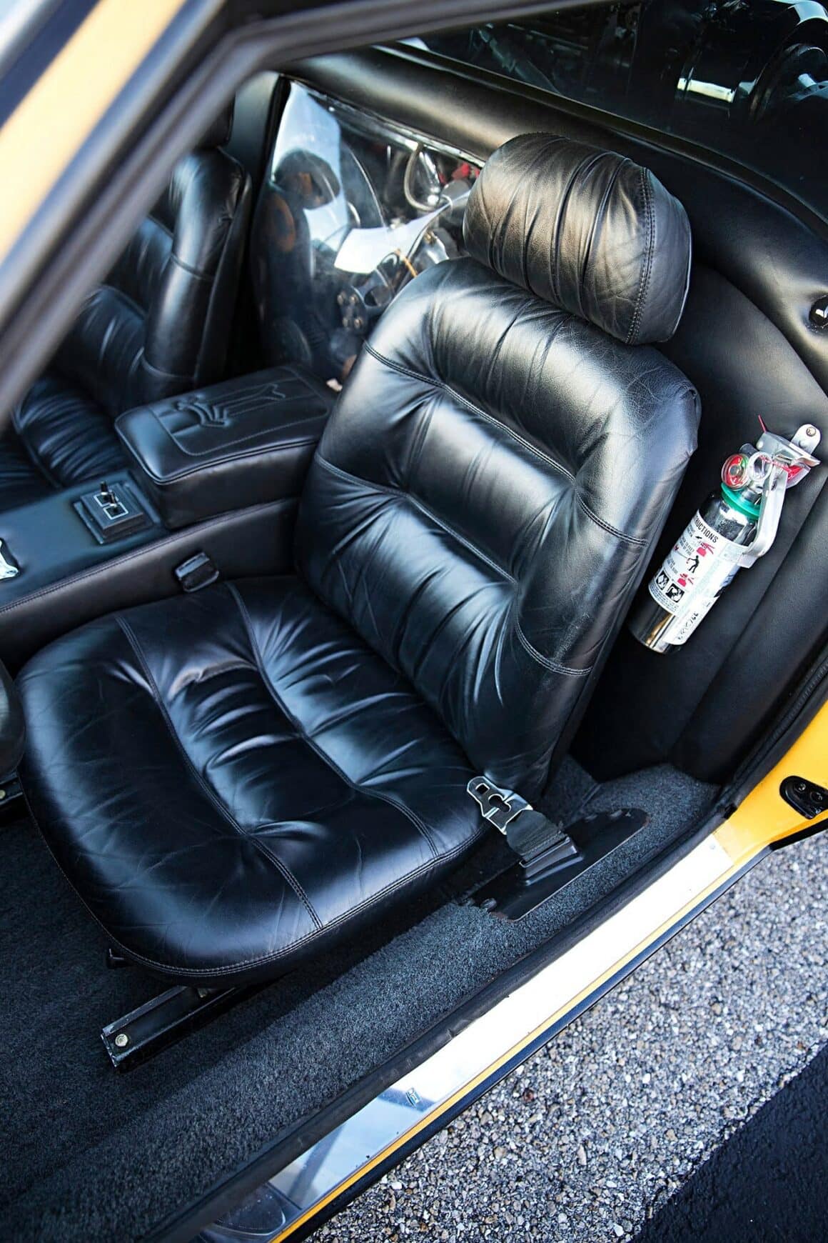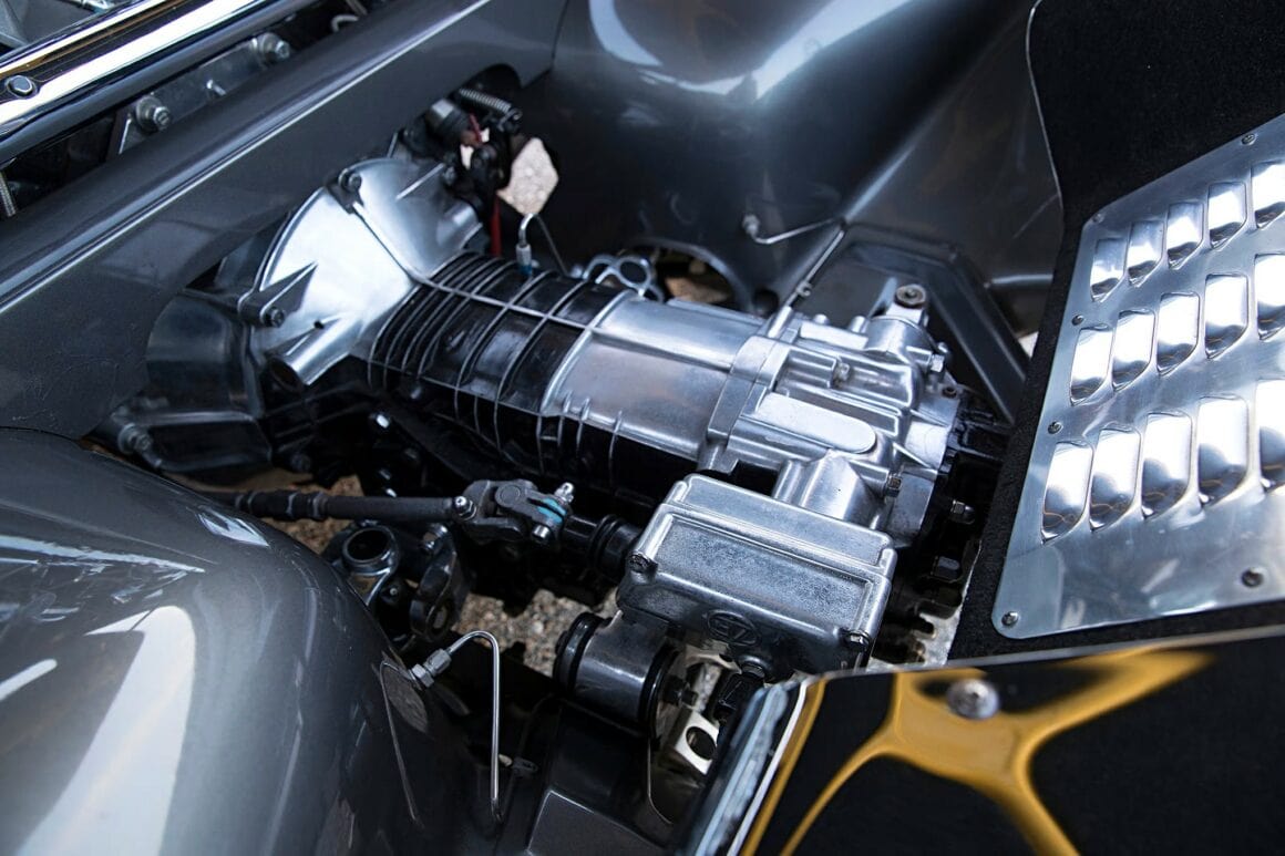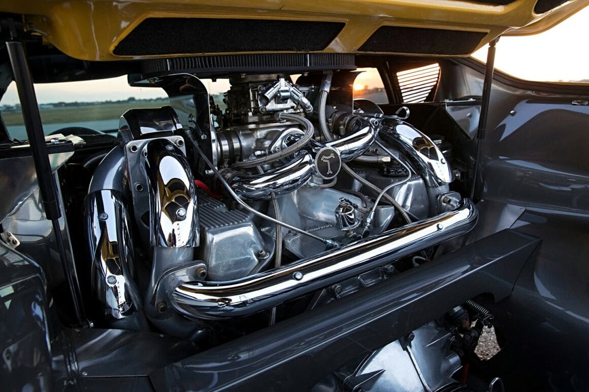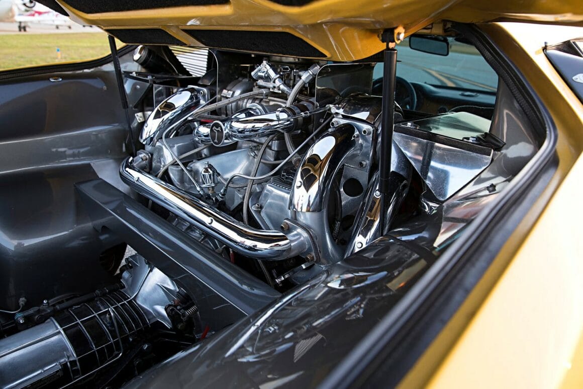 Le projet a débuté par un démontage complet et un trempage chimique de la coque…, ensuite, la carrosserie, les composants des suspensions et trains-roulants ainsi que pratiquement tout ce qui s’y rattache a été peint ou chromé selon les normes les plus strictes…, des élargisseurs d’ailes ont été ajoutés, les zones critiques du châssis ont été renforcées et les surfaces en tôle et les espaces entre les panneaux ont été ajustés bien au-delà des spécifications d’origine de l’usine…, tout a ensuite été recouvert d’une teinte “Pantera Yellow”.
