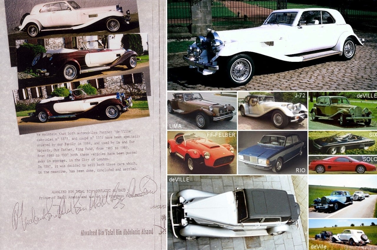 En 1984, le Roi Fahd d’Arabie Saoudite passe commande de deux Panther deVille, un Coupé et un Cabriolet. Il y est poussé par son ami, l’ex-dictateur d’Ouganda, Idi Amin Dada, qui est venu se réfugier en Arabie Saoudite et qui avait acquis quelques années plus tôt, une Panther deVille Berline 4 portes avec un bouchon de radiateur en Amétyste…., mi-1989, il les renvoie en Angleterre, dans une de ses résidences, à Londres. En 1985 les deux Panther du Roi Fahd sont terminées et envoyées en Arabie Saoudite ou le Roi Fahd va les utiliser très épisodiquement entre 1985 et 1989. Elles y resteront cloitrées, comme dans un Harem automobile, jusque 1997, année ou je rencontre le Prince Royal d’Arabie Saoudite : Alwaleed Bin Talal Bin Abdulaziz Alsand, qui me propose de les acheter…, ce que je fais sans hésiter. A cette date, quasi-personne au monde ne connaissait l’existence de ces 2 Panther « Royales« …