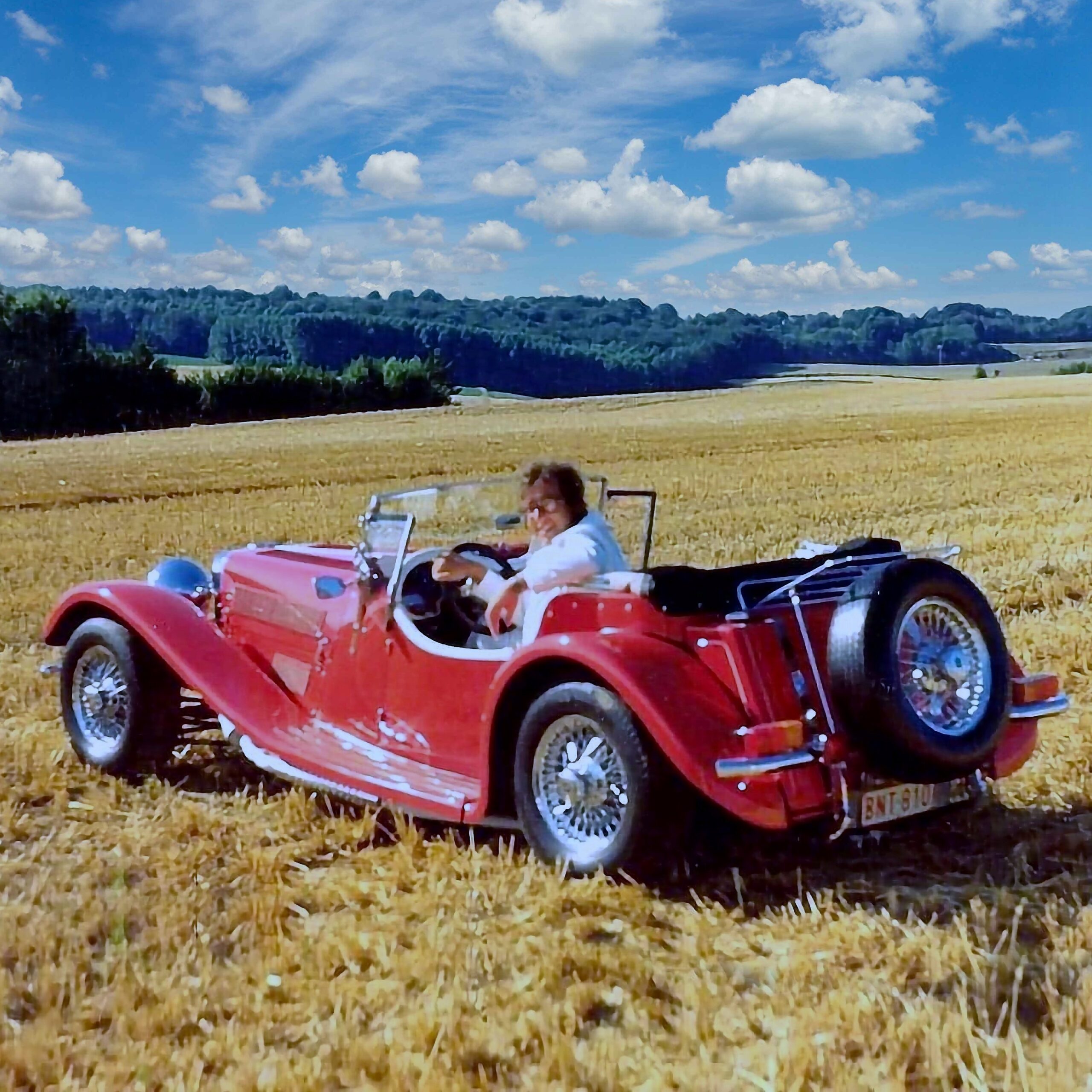 En 1989 un Anglais richissime (d’autant plus intéressé parce qu’elle est en configuration LHD en plus d’une direction assistée), vivant sur la Côte d’Azur, achète la Panther J72 bleue et la ramène chez lui près de Nice. La voiture va être alors déposée dans un garage de cette région afin d’être vendue en sortie d’indivision. Il va l’utiliser durant trois ans et parcourir seulement 3.300 kms, puis il va la revendre (à Nice) à un autre citoyen Britannique qui va circuler à son volant seulement 2.000 kms en ce compris le voyage retour vers Birmingham ou, son épouse demande le divorce, l’obligeant à revendre la Panther qui n’affiche que 5.300kms ! Le 16 septembre 1995, je voyageais en Angleterre avec deux amis, mon carrossier de l’époque et le Baron F.X.d’Huart.