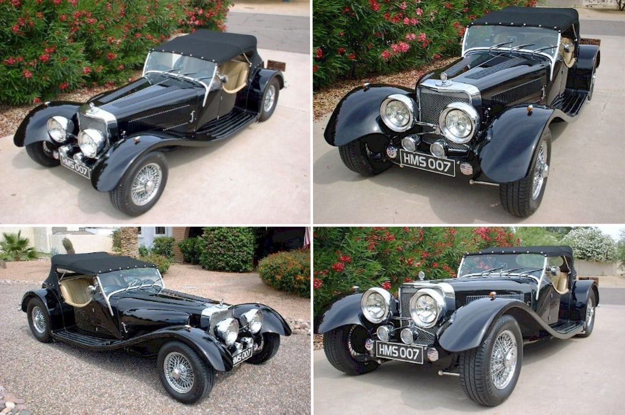Suppression du pare-choc avant et du cache radiateur d’huile devant le radiateur. Pose de deux phares additionnels d’époque et d’une plaque anglaise « à l’ancienne« …Des clignotants (Morgan) sont placés sur le dessus des ailes avant. Une mascotte de radiateur « à l’ancienne » est positionnée sur la calandre. Le pare-brise est incliné vers l’arrière (c’est un des points qui « marque » le plus le look « vintage« )… La capote d’origine est récupérée, seuls les flancs G/D de celle-ci sont modifiés. Pour la fixer en haut du pare-brise, c’est simple pour un sellier puisqu’il suffit de diminuer la longueur de la capote…La nouvelle découpe latérale de la capote, est typique de la Jaguar SS100… Pour parachever, les feux arrière (les boitiers rectangulaires) sont avantageusement remplacés par des feux de Ford B’32 avec leurs supports en alu poli. Une fixation de la plaque d’immatriculation « à l’ancienne » au-dessus du feu arrière gauche, achève de donner la touche vintage … Le porte-bagage est quant à lui supprimé et le pare-choc est dédoublé. Les jantes chromées à fixation centrale sont un plus qui n’est pas indispensable, mais qui devrait l’être (ce serait le point le plus coûteux de l’affaire)…L’intérieur n’est pas modifié, sauf la planche de bord avec des instruments disposés différemment… Le « gag » c’est le moteur, un 5L7 V-8 chevrolet… qui, s’il est bien plus « fun » que le jaguar 4L2 6cylindres en ligne, détruit l’aspect « vintage » de l’ensemble !