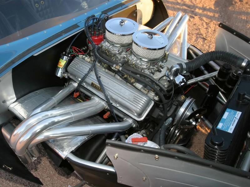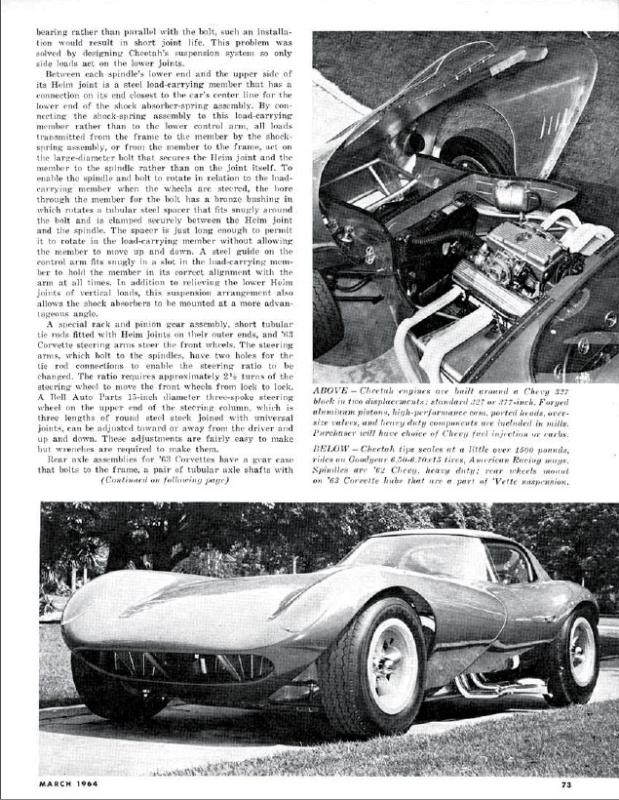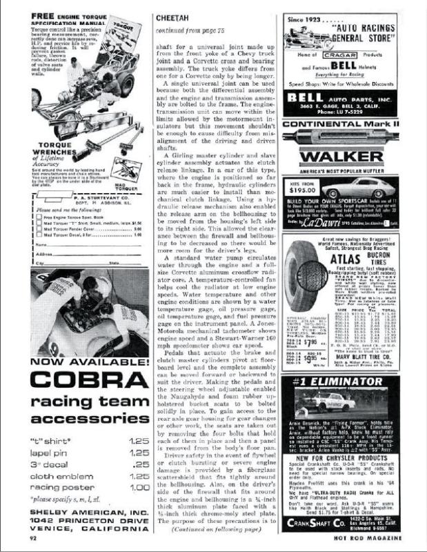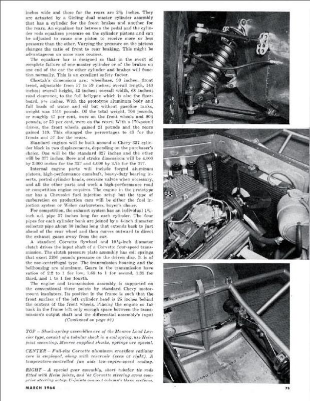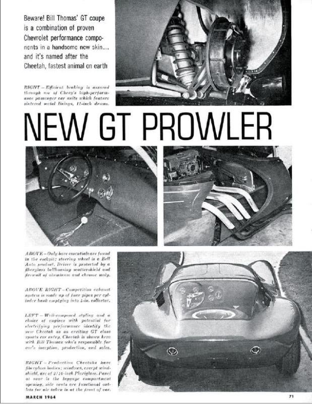 Chevrolet a donc fourni des moteurs et boîtes de vitesse (les mêmes que celles des Corvette’s 327 V-8 63/64/65)…, à Bill Thomas qui avait sollicité cette firme en leur garantissant qu’il allait construire une voiture de sport et de compétition capable de battre la Cobra… : La Cheetah !