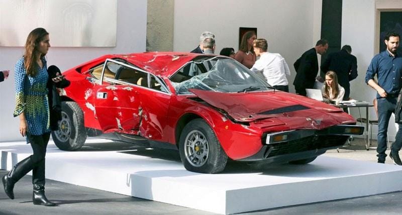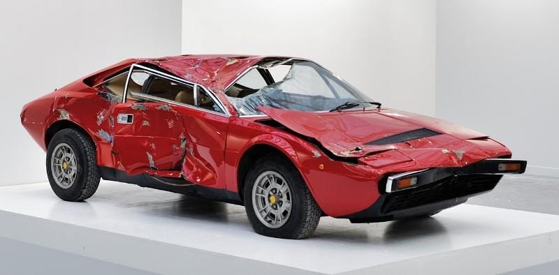 Ce que certains pourraient voir comme un vulgaire tas de ferraille était en réalité exposé et mis en vente sur Le nom de l’oeuvre : Dino…, comme le prénom accolé à la Ferrari 308 GT4, réduite ici à l’état d’épave à la suite de tonneaux subits à son bord par l’artiste plasticien Bertrand Lavier… qui a décidé de la convertir en œuvre d’art en 1993…, il suffisait d’y penser !