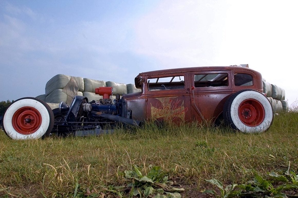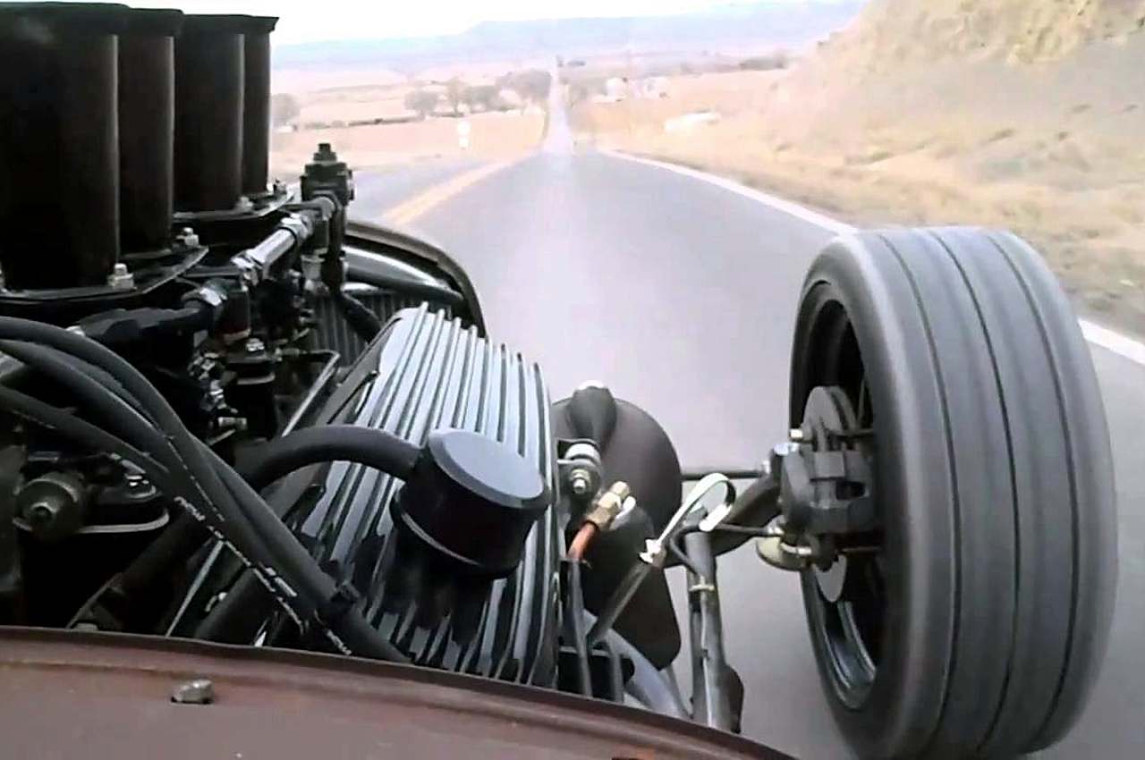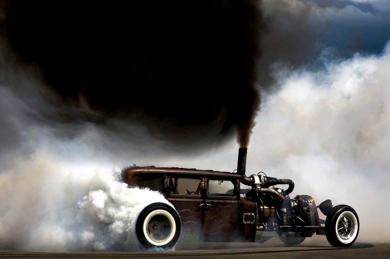Je donne le ton dès le début, un nuage de fumée s’élève dans les cieux lors d’un Burn-out en bonne et due forme…, l’image se fige, le Rat-Rod apparait, disparaît re-apparait… et… rien…, l’image reste inexplicablement bloquée sur cette nuée noirâtre et rougeoyante pendant qu’une zizique jouant du synthé à fond continue de marteler silencieusement l’intérieur de chaque moi-profond des “ceusses” regardant alternativement photos et texte en poussant des gémissements anticipatifs de crainte pour ce qui pourrait s’ensuivre : “De quoi ça parle c’t’article ?”