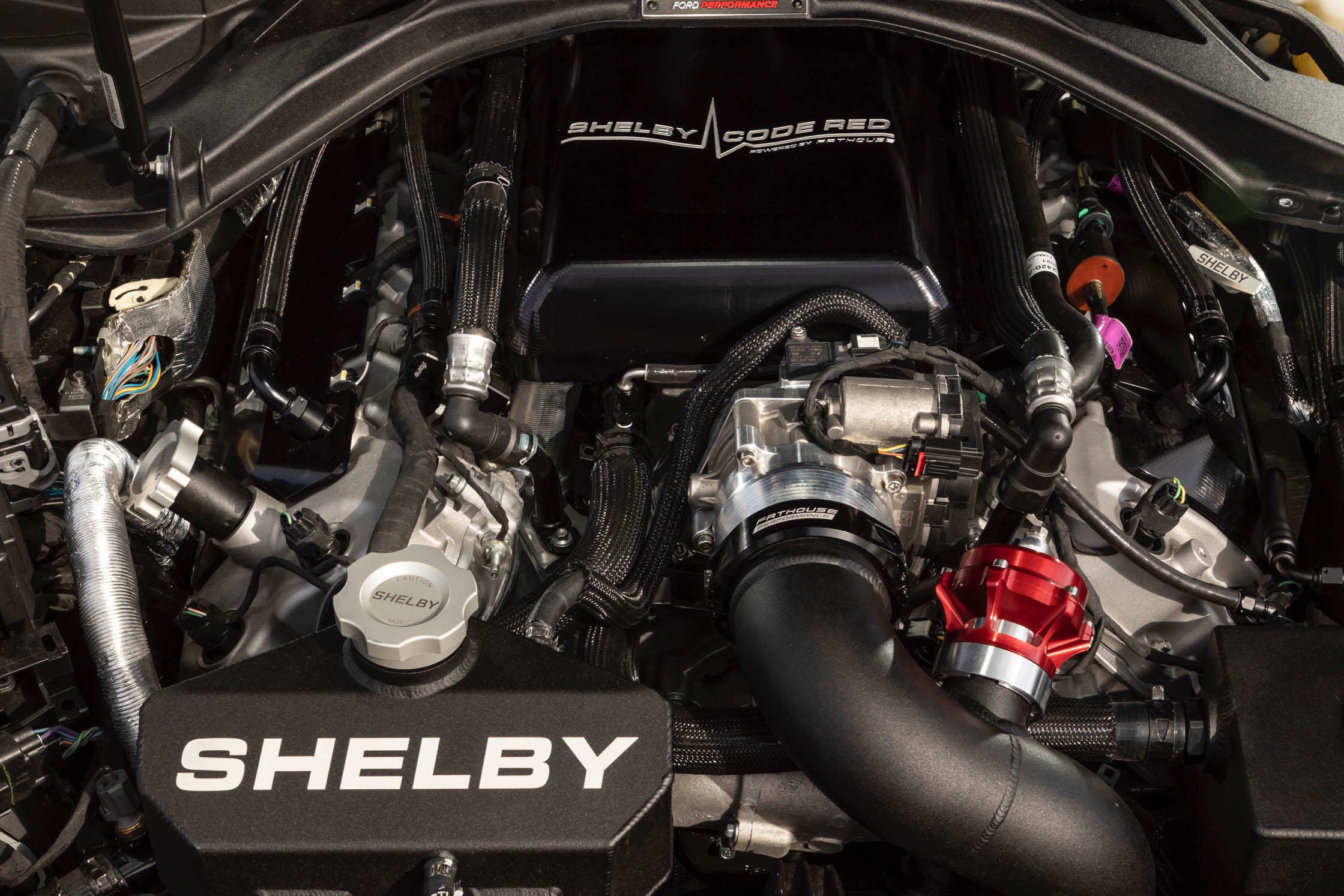 Pourquoi la Ford Mustang des cols bleus était-elle presqu’aussi rapide que quelque chose d’aussi étudié et raffiné que la Shelby ? Un indice vient d’une critique : les premières pensées étaient que la Mustang avait plus de puissance que déclarée. C’est une drôle de chose à dire à propos d’une Mustang de 500 chevaux qui a une grande plage de puissance, avec beaucoup de couple et une limite de régime de 7.500 tr/min. Plutôt noble pour ce que c’est !