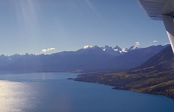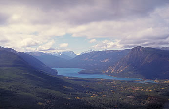 À l’extrémité de la branche Nord du lac Quesnel, la vallée se referme soudainement par un verrou glaciaire et derrière il y a le lac Mitchell, c’est un beau lac au pied de montagnes enneigées et d’un beau bleu-vert des eaux de fontes des glaciers environnants.