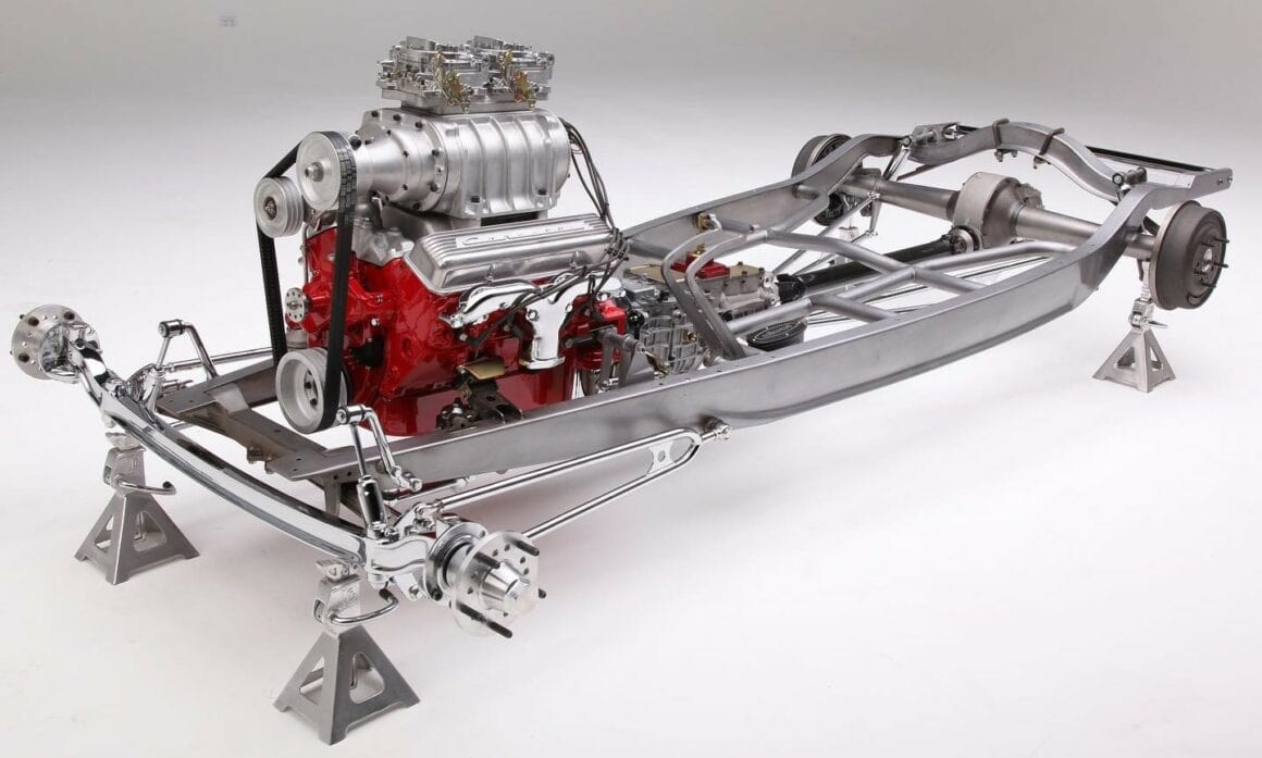 Mais avec suppression des cornes avant qui ne servaient qu’a fixer les antiques ressorts à lames. Le ressort nécessaire est remplacé par un élément WSS, 5po plus long qu’un ressort d’origine, situé derrière l’essieu, ce qui donne un empattement plus long de 2po que celui d’origine. Un essieu de 1932 a été abaissé de 4po, tandis que des embouts de tirants “type stock” sont utilisés sur ce qui est surnommé “les épingles à cheveux” formant le tirant et le lien de traînée. Il y a aussi de nouveaux amortisseurs à bras de levier modèle A à carrosserie billettée par Bill Stipe qui contrôlent l’amortissement.