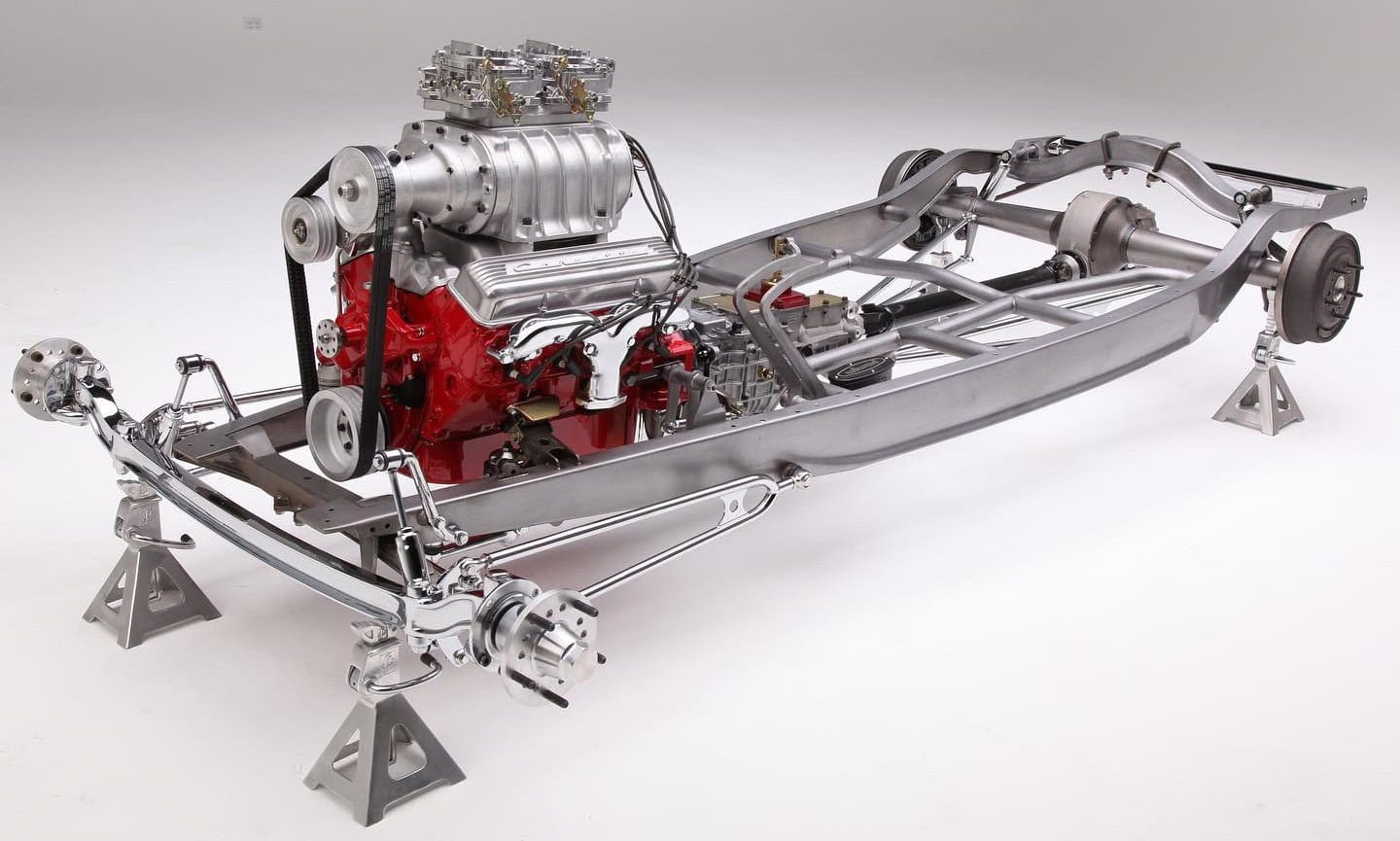 Sous tout cela se trouve un Chevrolet V8 ZZ383ci avec des têtes en aluminium, ainsi qu’un compresseur Walden 4-71. Deux carburateurs Holley 2BBL ULTR-HP de 500 cfm sur un adaptateur de carburateur WSS avec tringlerie personnalisée complètent le tout… WSS a fabriqué les collecteurs de 1-3/4po ainsi que le système d’échappement de 2-1/2po. Ce coupé est équipé d’une boîte de vitesses manuelle, une Legend LGT-700 à cinq vitesses, reliée au volant d’inertie GM par l’intermédiaire d’un embrayage Centerforce… JE Reel a fabriqué l’arbre de transmission personnalisé.