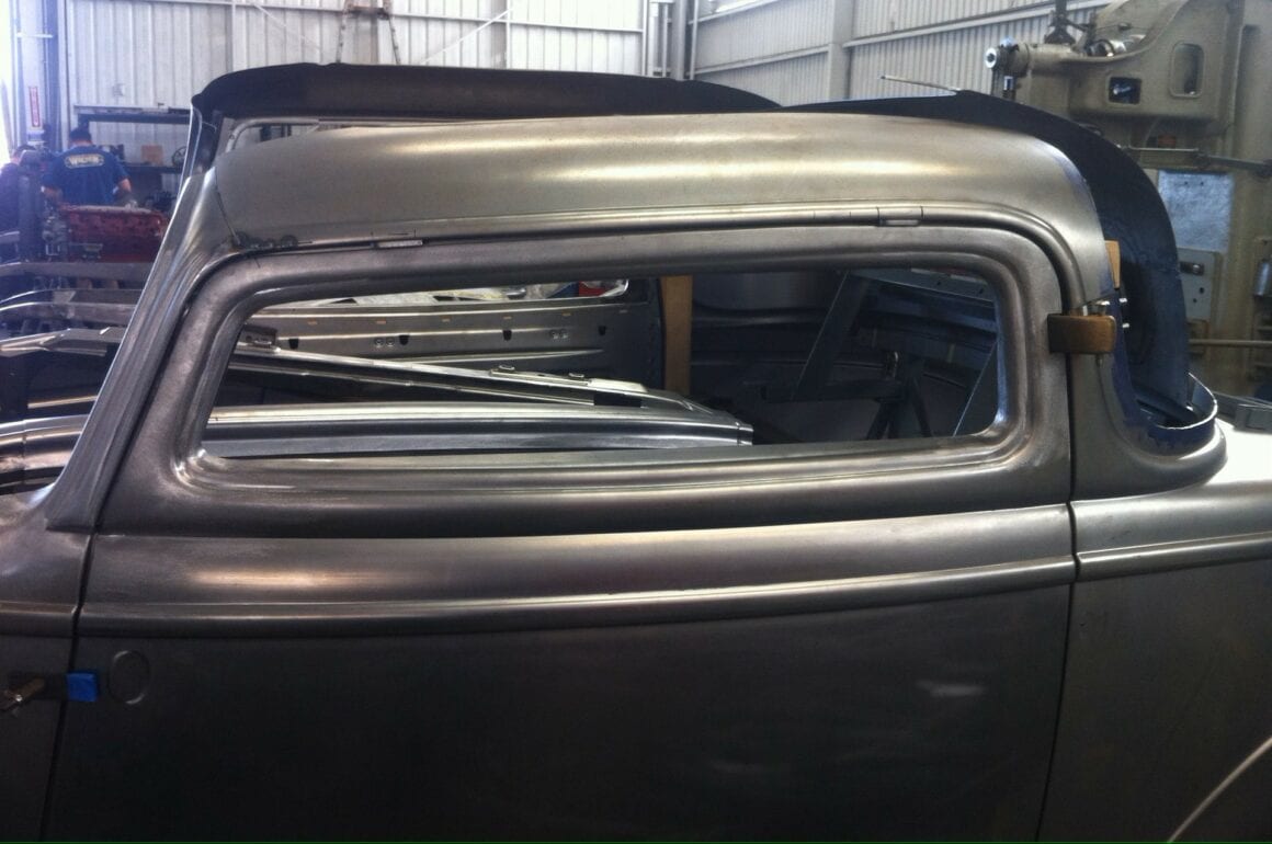 Si le châssis roulant est une œuvre d’art, la carrosserie qui le recouvre l’est tout autant. Livré par Brookville sous la forme d’une collection de panneaux non assemblés, il a été assemblé par WSS, puis modifié. Il a été coupé de 5-1/2po à l’avant et de 4-1/2 à l’arrière, les montants du pare-brise sont penchés vers l’arrière de 2po et la lunette arrière s’est inclinée vers l’avant de 3/4po. L’arrière du capot a été relevé de 5/8po au niveau du pare-brise afin de poursuivre visuellement la ligne du haut du capot jusqu’à la base du pare-brise, et toutes les coutures de la carrosserie ont été soudées bout à bout et finies en métal.