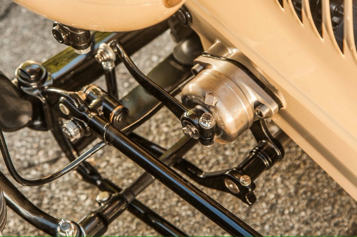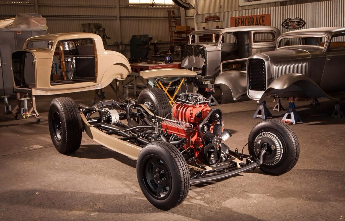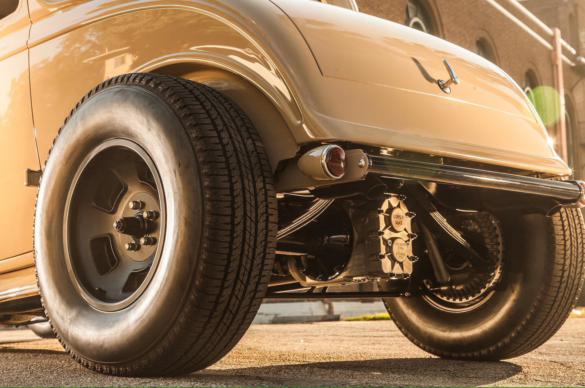 Des nouveaux freins à disque Kinmont de chez Deuce Manufacturing (la première paire en production), complètent l’avant. À l’arrière, un pont différentiel quick change Speedway Engineering est suspendu à un ressort arrière modèle A et à des barres d’échelle Jitney/WSS, à des amortisseurs QA-1 et à une barre stabilisatrice WSS, les bras de la barre stabilisatrice étant dissimulés. Les freins arrière sont à disque (style Kinmont), avec frein de stationnement interne. Comme si un moteur grillé ne faisait pas assez de déclaration, la décision de recouvrir l’ensemble d’une finition Testarossa Red le fait certainement.