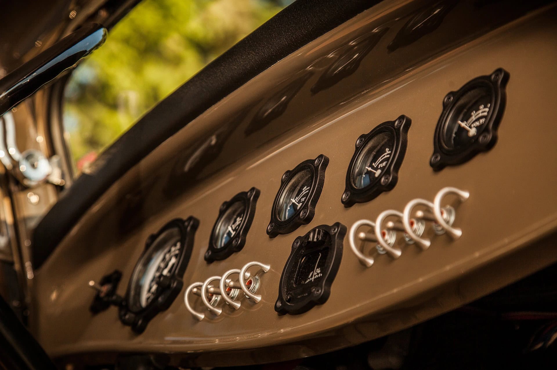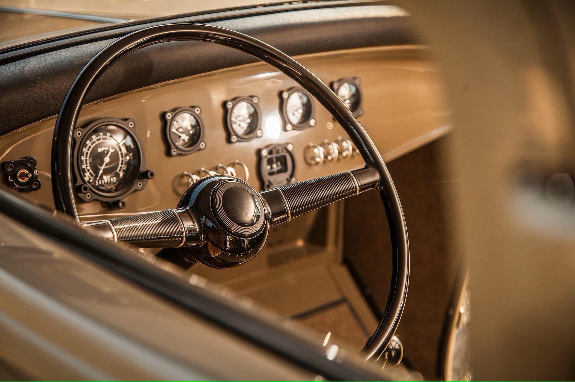 Poursuivant sur le thème de l’avion, les compteurs Classic Instruments Bomber Series ont été choisis, mais une fois installés, Bobby Walden a senti qu’il manquait quelque chose. Se référant à un livre sur les avions japonais Mitsubishi Zero, il s’est rendu compte qu’il s’agissait d’une boussole, alors il en a acheté une et a fait imprimer une lunette en 3D pour correspondre aux autres. L’interrupteur de clignotant a une lunette similaire, tandis que tous les interrupteurs ont des protections, tout comme un avion. Tout est dans les détails, comme vous le voyez.