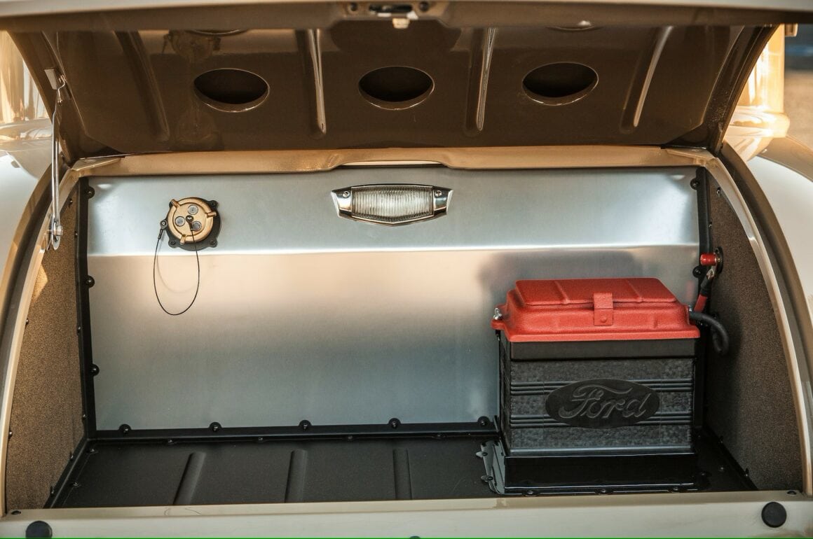 Comme le boîtier de batterie, est un vieux cache de batterie Ford, éviscéré pour contenir une batterie moderne, le couvercle d’un boîtier de batterie de tracteur Ford a été élargi pour s’adapter. Le revêtement de sol est en liège avec des garnitures en aluminium. Les coussins de siège en cuir sont fabriqués/usinés à la main avec graphiques “Rising Sun” par “Duane Ballard Custom leather”, qui a également ajouté des détails aux ceintures de sécurité reconstruites de l’avion et refabriqué des accoudoirs sur les portes.