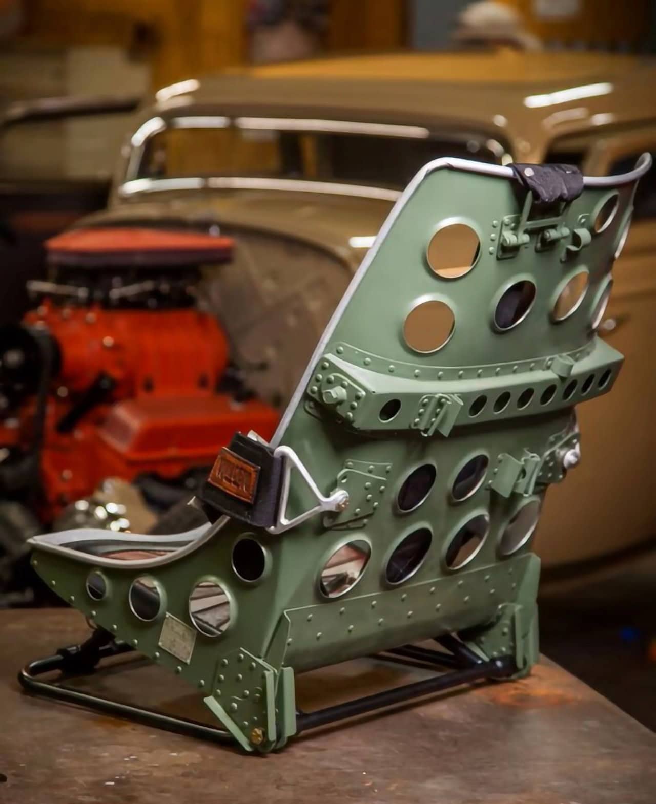 Il avait toutefois été préalablement exposé aux États-Unis au West Coast Nats à Pleasanton, où le propriétaire l’a vu pour la première fois. Bobby et Melinda Walden ont eu l’occasion de conduire le Hot Rod qu’il avaient réalisé, au Japon, lorsqu’ils ont été invités au Mooneyes Show à Yokohama en décembre dernier 2024, c’est maintenant à Takehito San de s’occuper de ce Hot Rod très spécial. Il me faut toutefois revenir sur les sièges copiés de celui du fameus Zéro. Le plan initial était d’utiliser des sièges bombardiers traditionnels de B17, mais Bobby Walden a estimé qu’il avait besoin de quelque chose de différent.