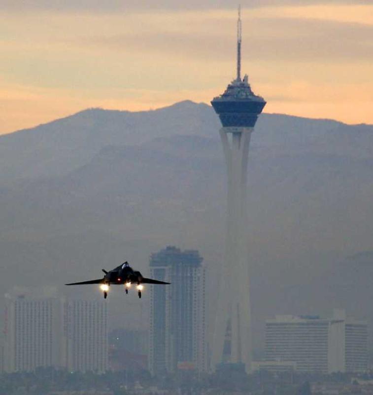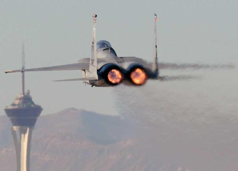 Talking about loud and fast, here’s the F-15 Eagle demonstration ship hurtling off in the direction of the Las Vegas strip.