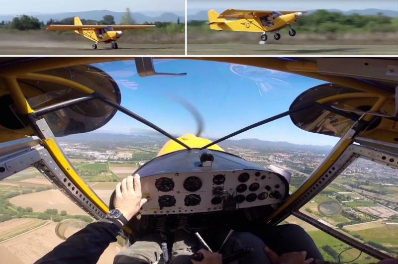 Manche en arrière, assiette de cinglé…, il aura fallu moins de 80 mètres pour décoller et 40 de plus pour passer un obstacle de 15 mètres…, du grand art…, l’assiette à cabrer est dantesque, mais l’ULM tient bon, accroché à l’hélice et à ses surfaces optimisées par l’ajout de VG. Dès la rentrée des volets, le pilote cherche le meilleur taux de montée : 600 ft/mn à 80 km/h ; 700 ft/mn à 90 km/h ; 900 ft/mn à 100 km/h ; 800 ft/mn à 115 km/h…, finalement il opte pour 100-110 km/h…, il n’y a presque aucune correction à apporter aux palonniers durant cette phase de vol, ni d’ailleurs durant aucune autre.