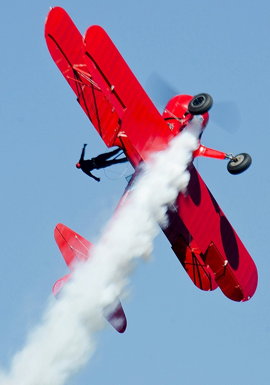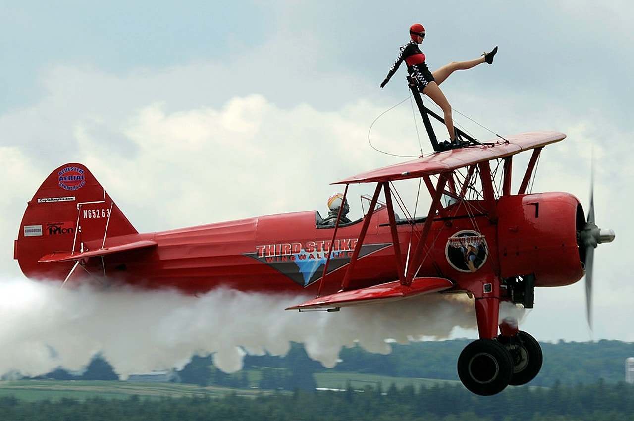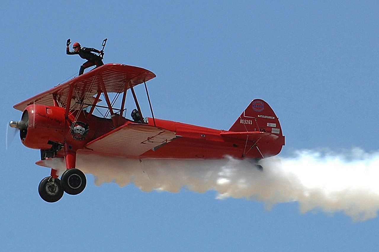 Le wing walking, c’est l’art de se promener sur les ailes d’un avion alors qu’il exécute des manœuvres acrobatiques. L’avion fait des tonneaux, des vrilles, des renversements et beaucoup d’autres figures. Pendant ce temps, j’exécute mes propres figures acrobatiques, comme le human flag (« drapeau humain »), au cours duquel je me pends par les bras au sommet de l’appareil. Il m’arrive aussi d’y faire le poirier.