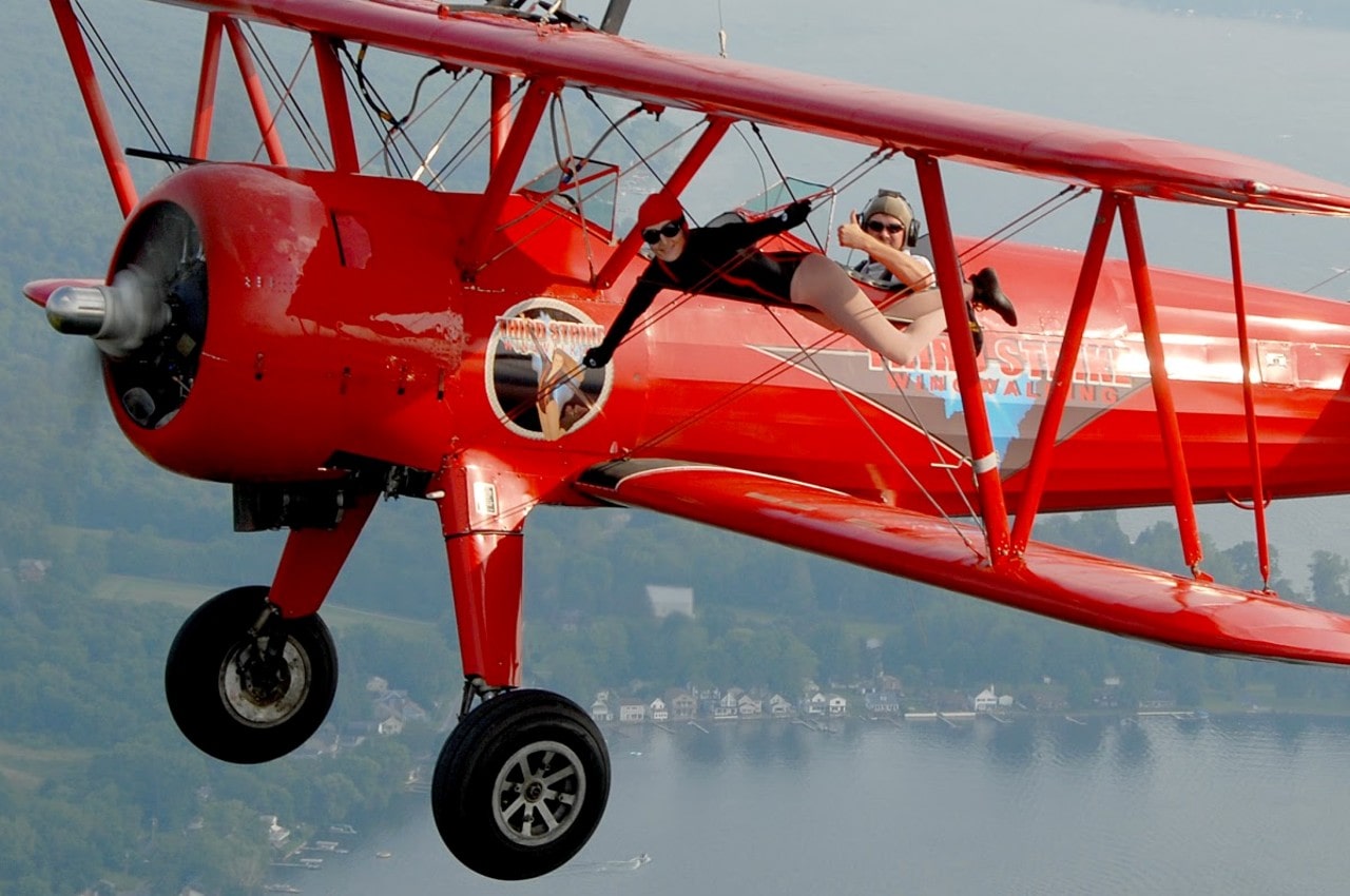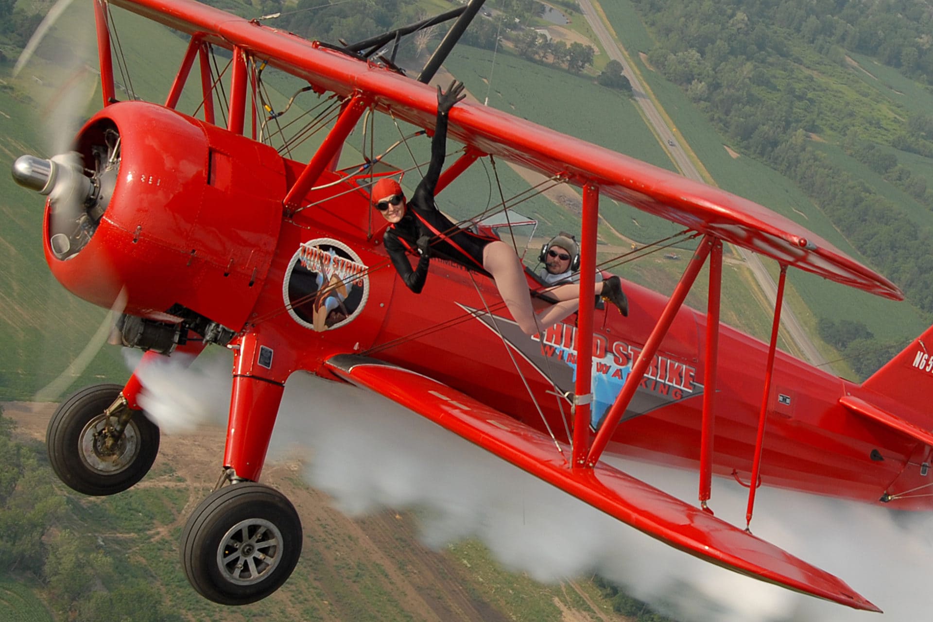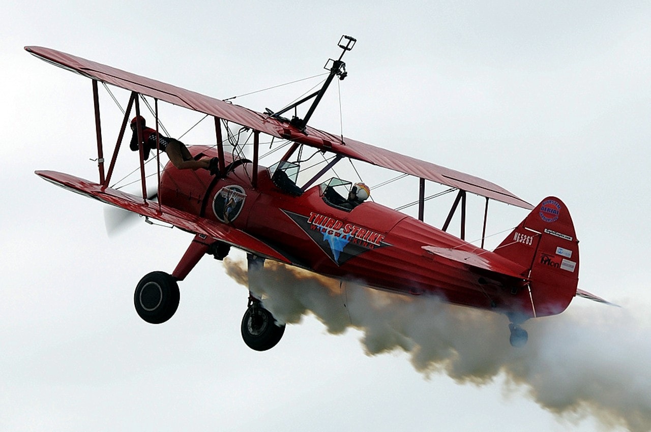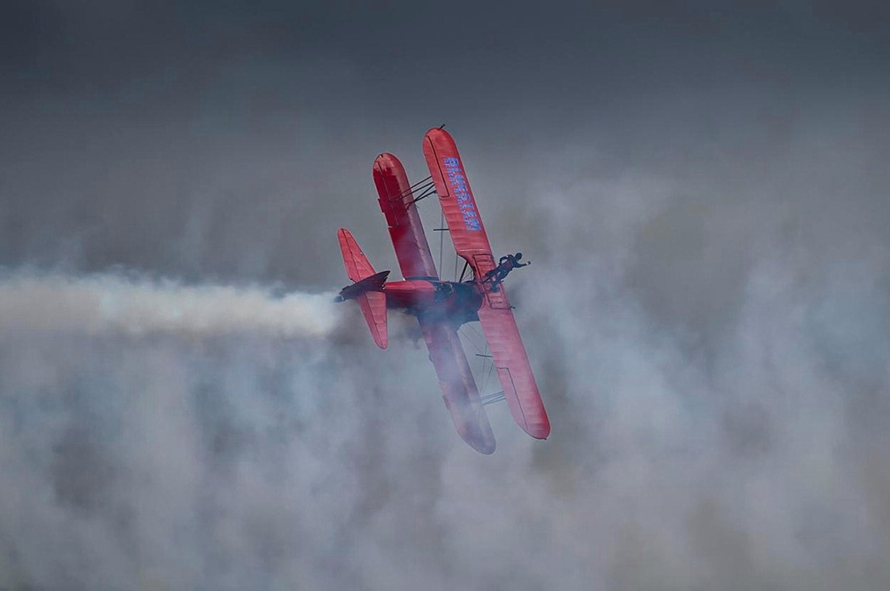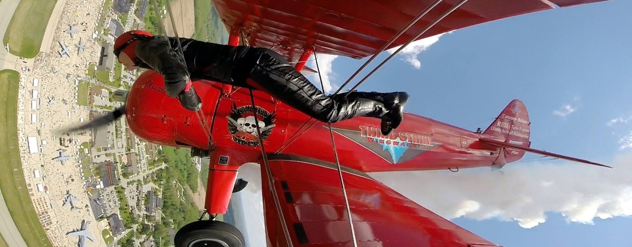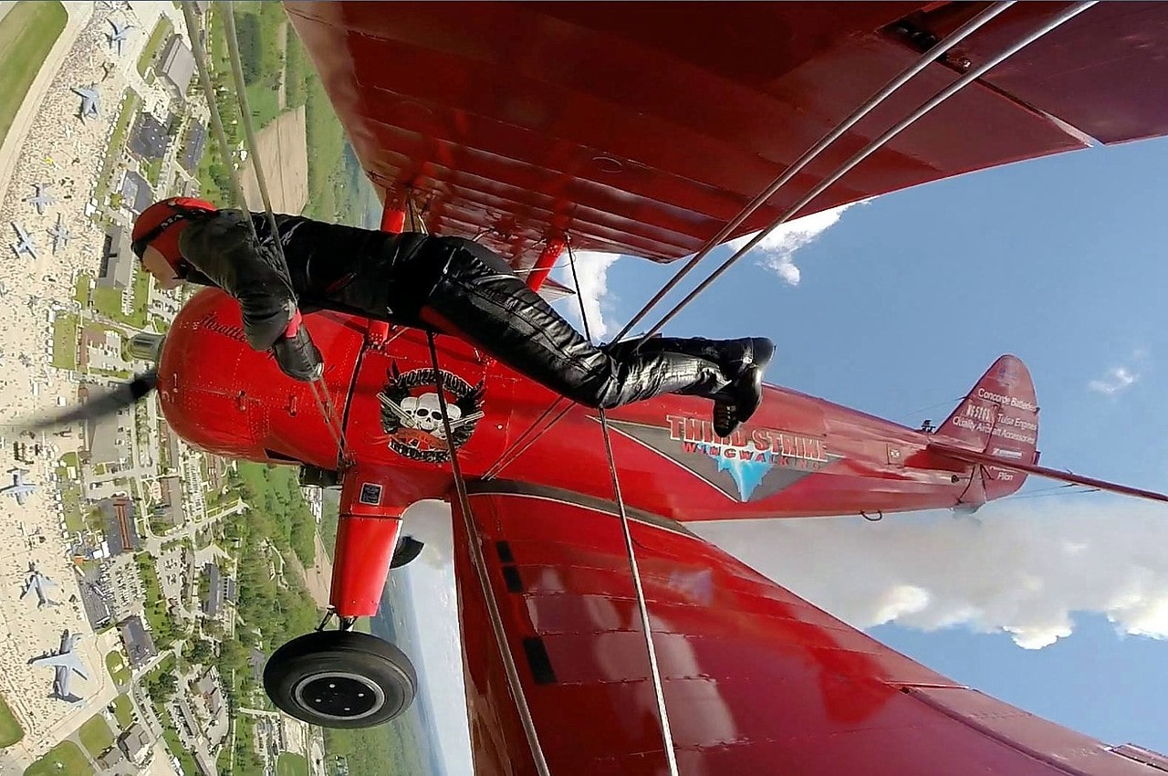 Sur les flancs rutilants de la carlingue apparaît le logo de Third Strike Wingwalking… et, perchée sur l’aile parasol de l’avion, défiant la vitesse, l’altitude et la raison, une silhouette humaine et fragile, dangereusement penchée vers l’arrière.