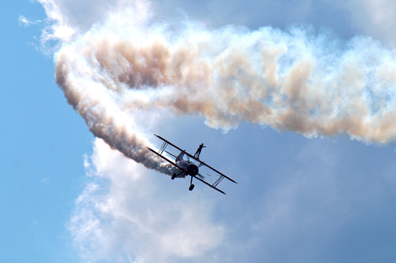 Il faut aussi tenir compte des conditions climatiques. Quand il n’y a qu’un peu de pluie fine, on peut faire tout de même voler, mais ce n’est pas sans risque. Car pendant les prestations, nous mettons de l’huile dans le système d’échappement, qui est à l’origine de la belle fumée blanche que l’avion laisse derrière lui. Elle le recouvre entièrement, et lorsqu’elle se mélange à l’eau, le fuselage devient glissant. C’est pour cela que lorsqu’il pleut, je reste au sol. Ça n’a pas toujours été le cas, mais il faut aussi savoir que ça fait mal. J’ai déjà fait du wing walking sous la pluie et sous la neige, et les deux font très mal. C’est comme si l’on me jetait des rafales de pierres au visage.