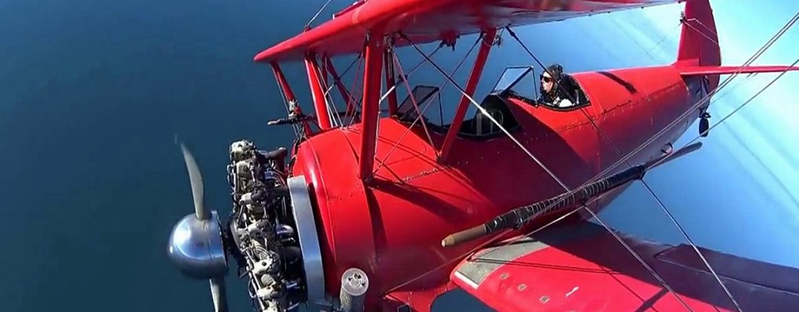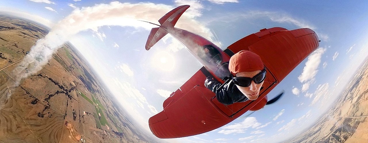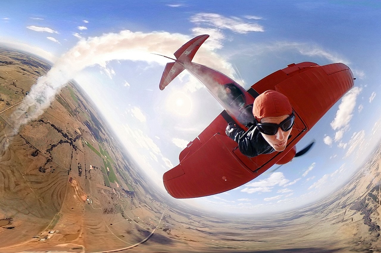 À plusieurs centaines de mètres au-dessus du sol, l’avion biplan entame une courbe ascendante pour effectuer un looping.