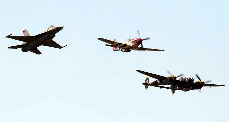 The Fighting Falcon also teamed up with the Mustang and the Lightning in one of the air force’s excellent Heritage Flights, which show off historic types alongside modern weaponry.