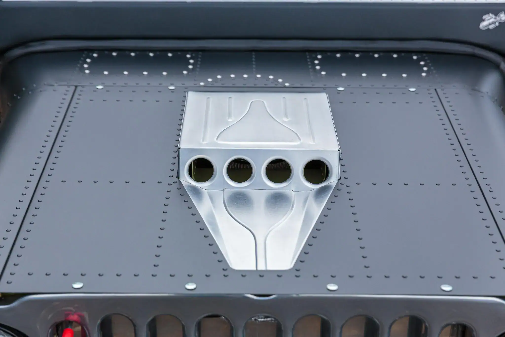 Un éclairage de type aviation militaire a été ajouté, comprenant des feux de navigation latéraux et des feux de reconnaissance sous le véhicule. Les flancs et l’empennage apparents ont été polis. La peinture personnalisée a été spécialement choisie pour reproduire les couleurs et les finitions des avions militaires américains de la Seconde Guerre mondiale, et notamment le châssis et les jantes peintes dans la teinte utilisée pour les trains d’atterrissage des avions.
